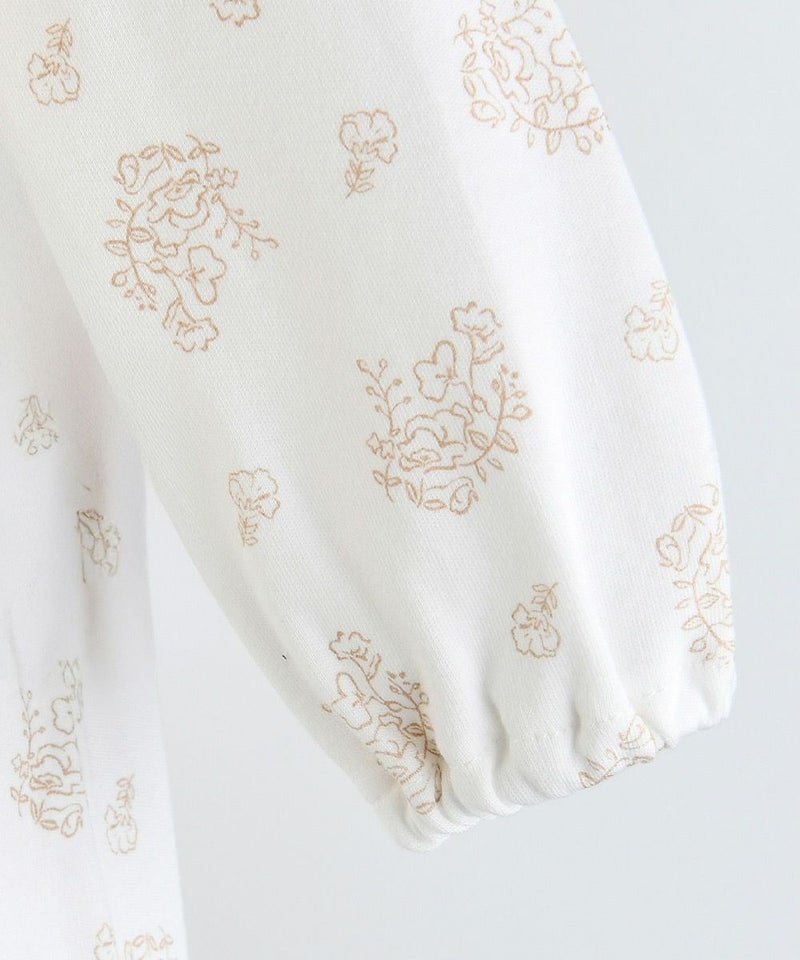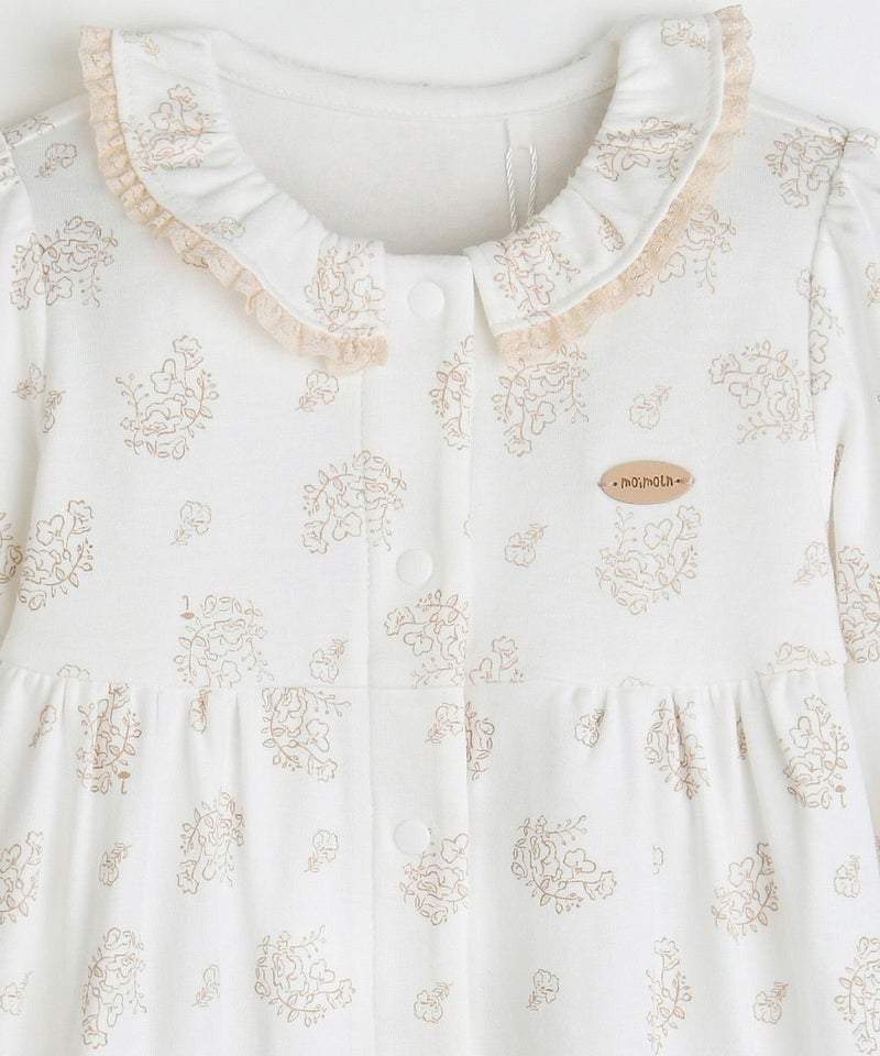 吸湿性にも優れ、素肌にやさしい滑らかな肌ざわりが特徴のレーヨン生地を使用した長袖カバーオール。襟にはプリントと同柄のレースフリルをあしらい、おしゃれ感がアップ、胸元にはさりげなくブランドロゴのプレート付き。袖や裾はゴム入りで優しくフィットし、スナップボタンでお子さまの着替えも簡単にできます。お子さまののデイリーウェアとしてはもちろん、ギフトにもおすすめの商品です。