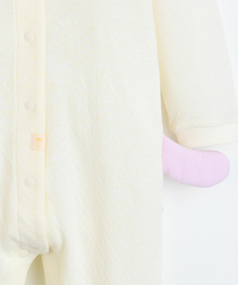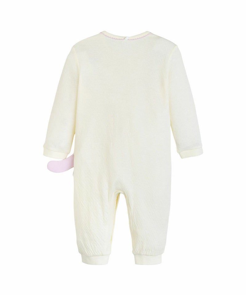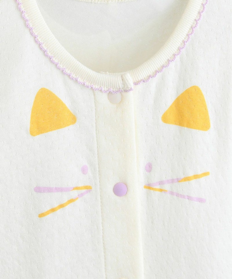 ネコのミャオ(meow)プリントがとってもCuteな長袖カバーオールとヘアバンドのセット。首元のラベンダーステッチやセットのヘアバンドのネコ耳、腰のネコしっぽでリアルネコちゃんに変身できます。スナップボタンでお子さまの着替えも簡単。コットン素材の商品は、着心地・肌へのやさしさ・快適性に優れた、毎日着たくなる安心素材です。お子さまのデイリーウェアとしてはもちろん、ギフトにも大変喜ばれるおすすめのセット商品です。