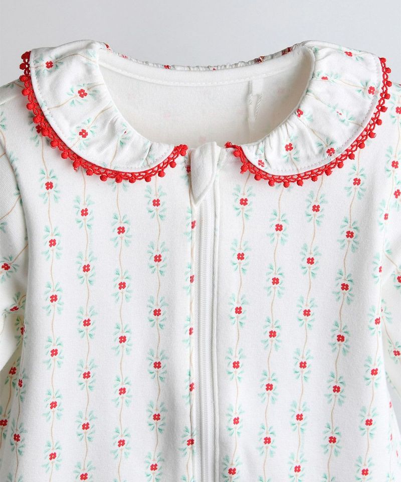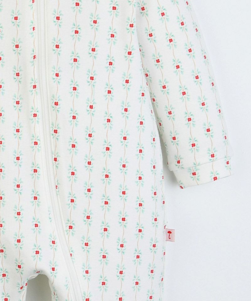 赤い小花がたくさん咲いたガーデンのような総柄プリントの長袖のカバーオール。フリル付きの襟と縁取りに赤い刺繍ステッチがアクセントに。脱着にうれしいWファスナーで脱着が簡単、ファスナーの内側にはファスナーガードを付け、肌への刺激を防止しています。お子さまのデイリーウェアとしてはもちろん、ギフトにも大変喜ばれるおすすめのセット商品です。