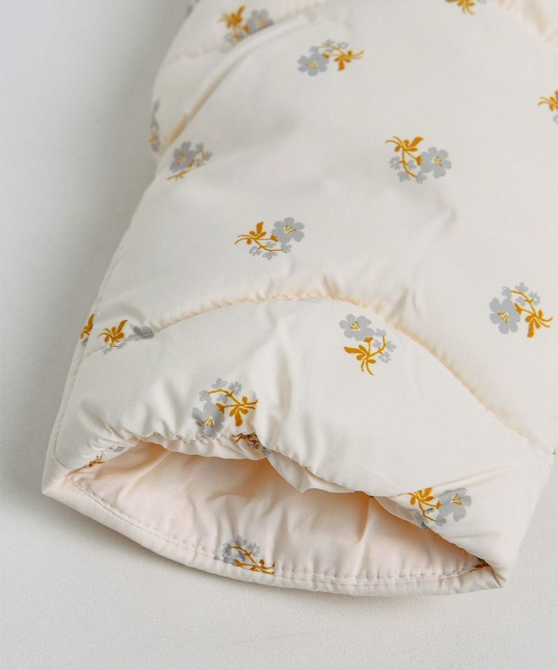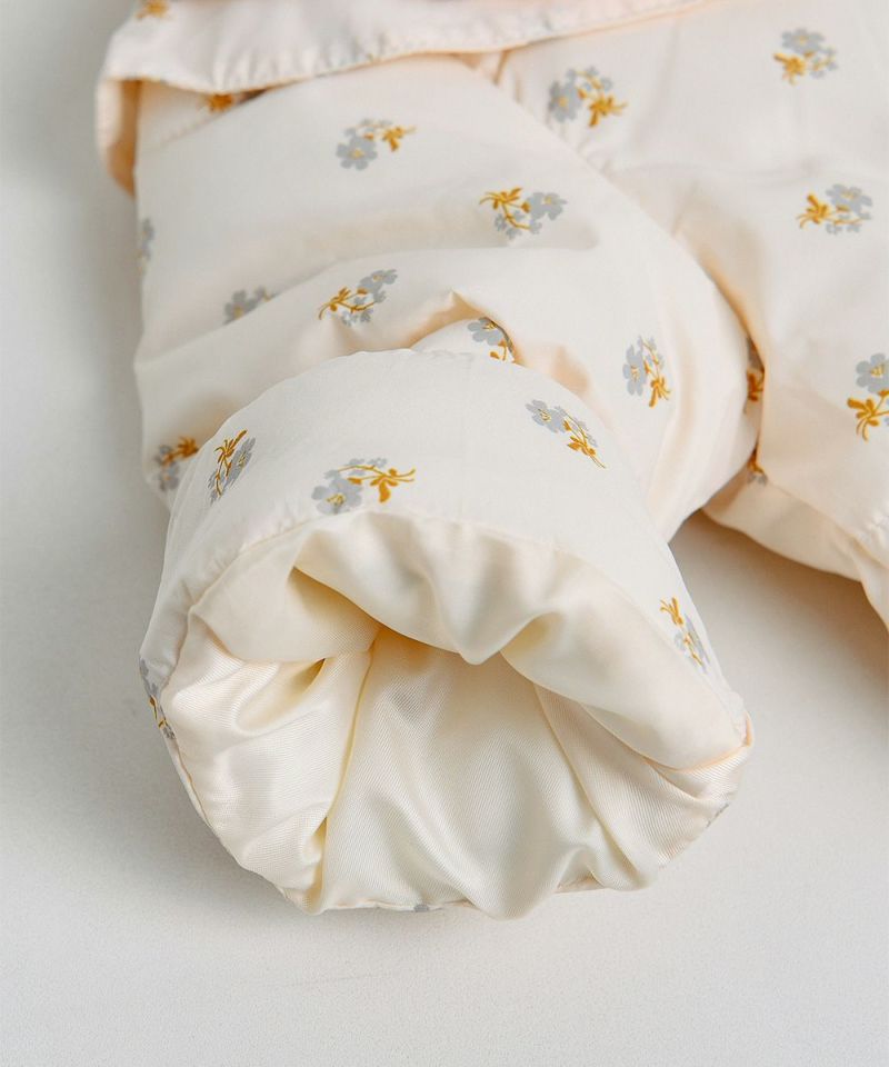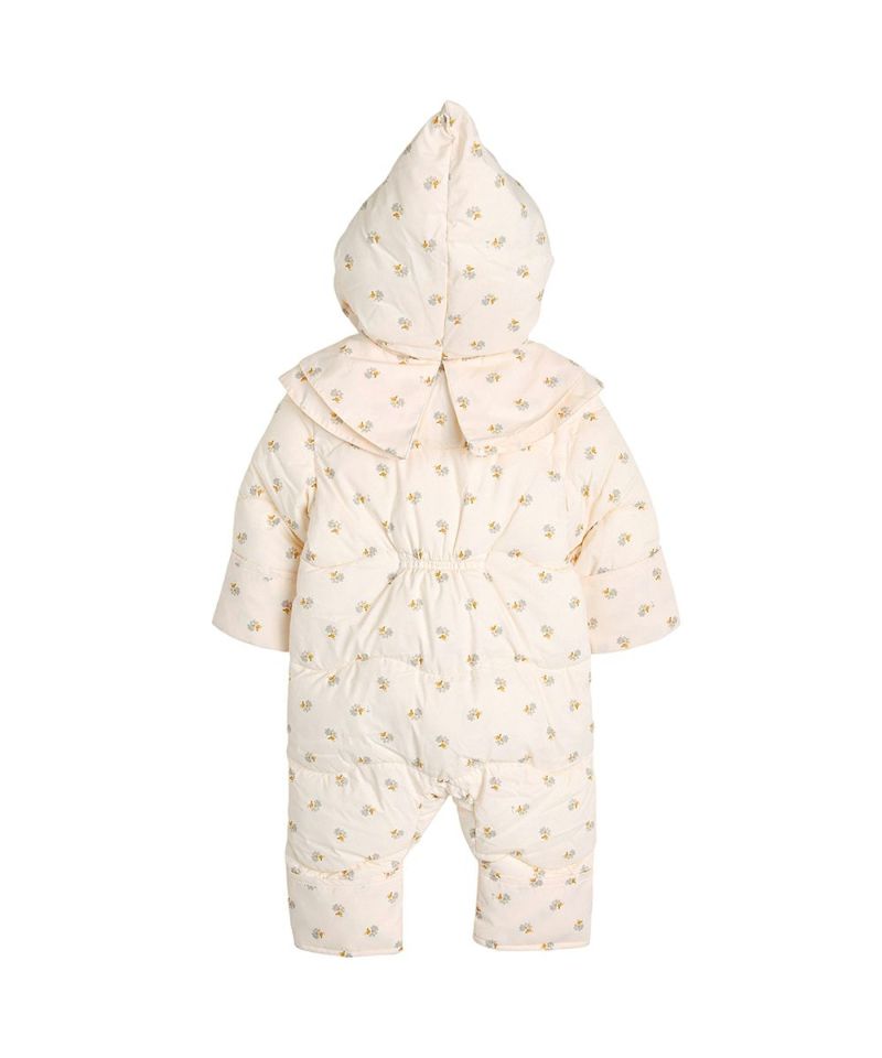 ソフトな雰囲気の総柄とユニークな大きな襟がポイントのカバーオール。裏地のボア地が暖かく、環境に優しい素材を使う事で、環境まで考えたアイテムです。