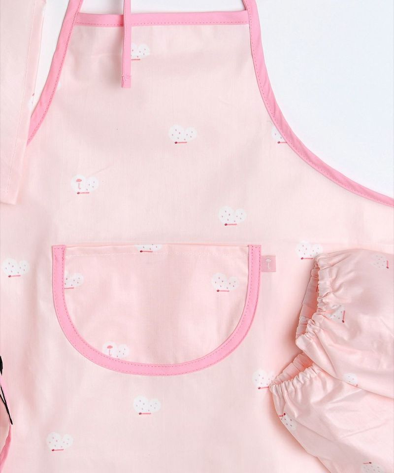 バタフライデザインのエプロンセット。防水処理されているので汚れにくく、頭巾とアームカバー、エプロンに収納ポーチまでセットになっていて収納と携帯に便利な実用的なアイテムです。
