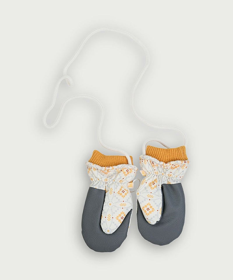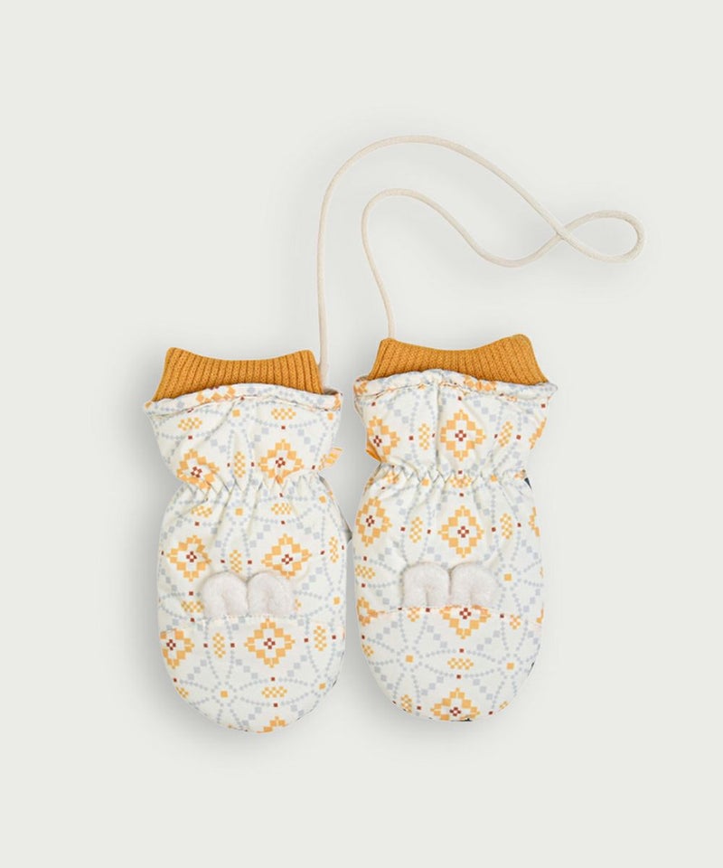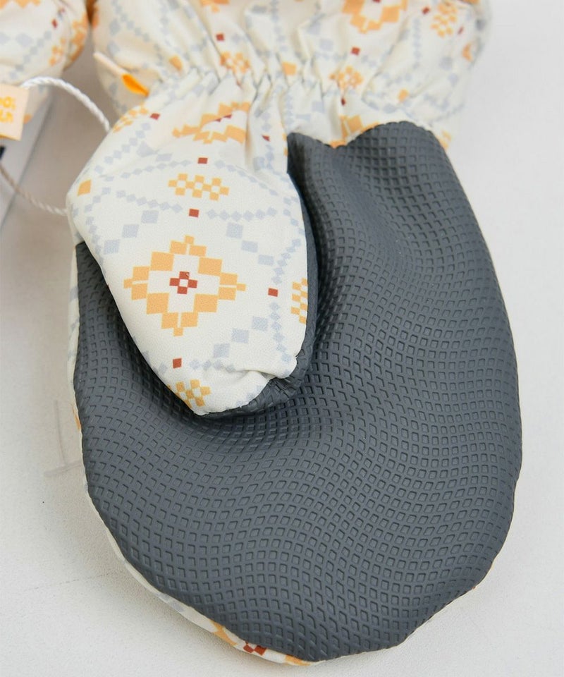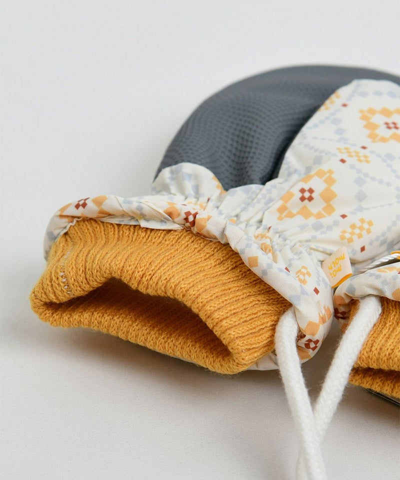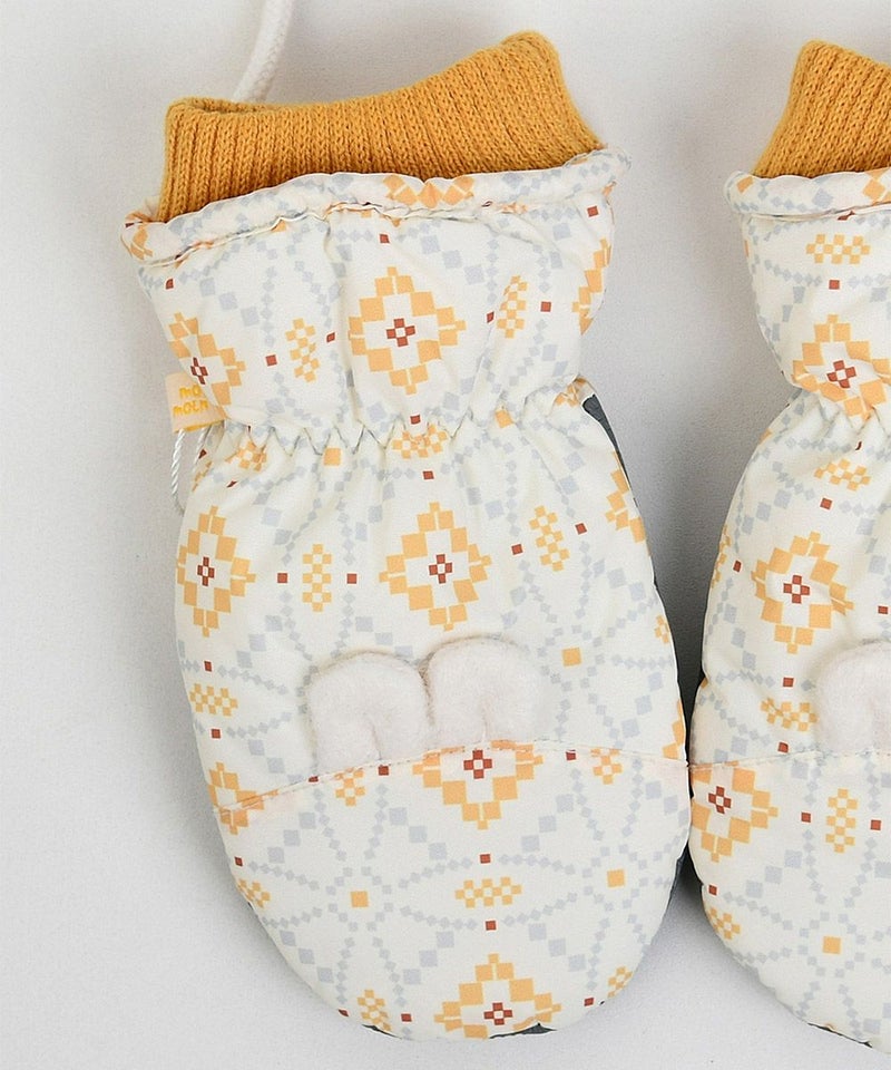 はっ水コーティングされた生地で作られており、冬の季節にぴったりのミトン。可愛いクマさとウサギのポイントをファー生地配色で表現したタイプと、イエローカラーはモイモルン独自のノルディックなパターンを使用しコーディネートのポイントになるアイテムに仕上がっています。手首はリブを使用し、しっかり寒さを防止。手の平には滑り止めになる生地が付き、紛失防止のために紐が付いています。