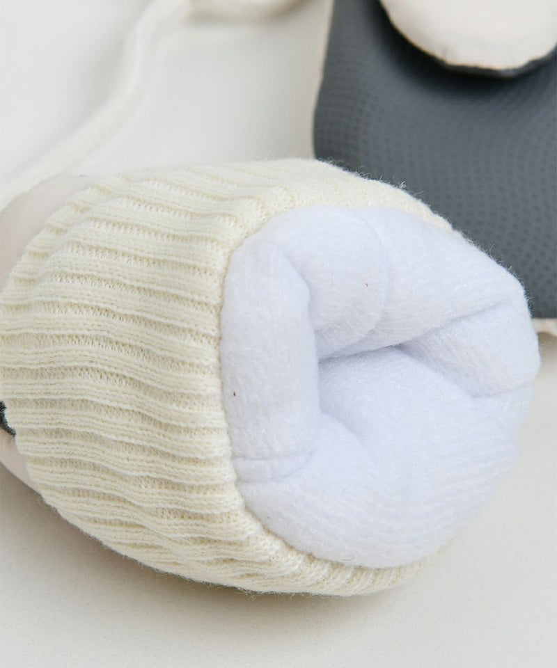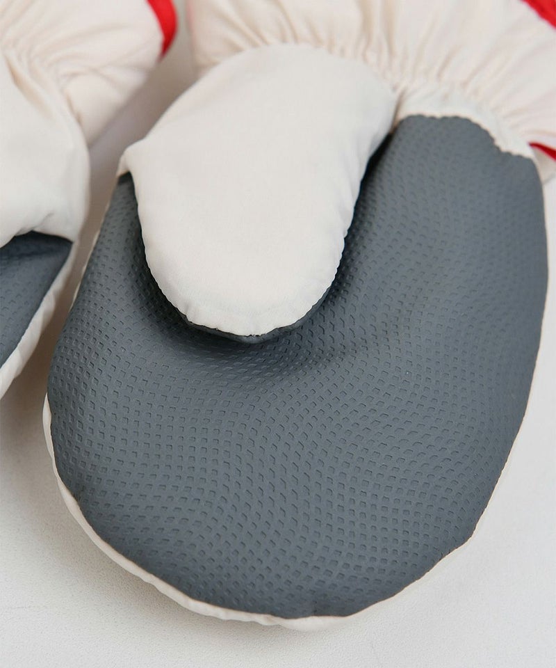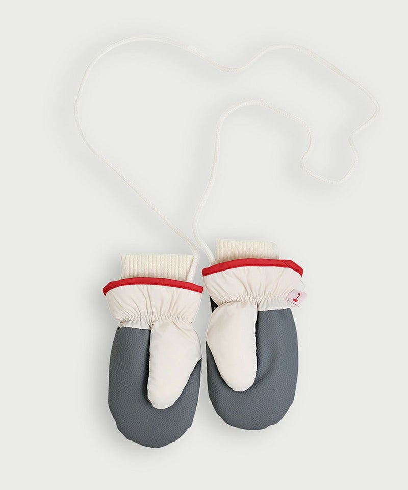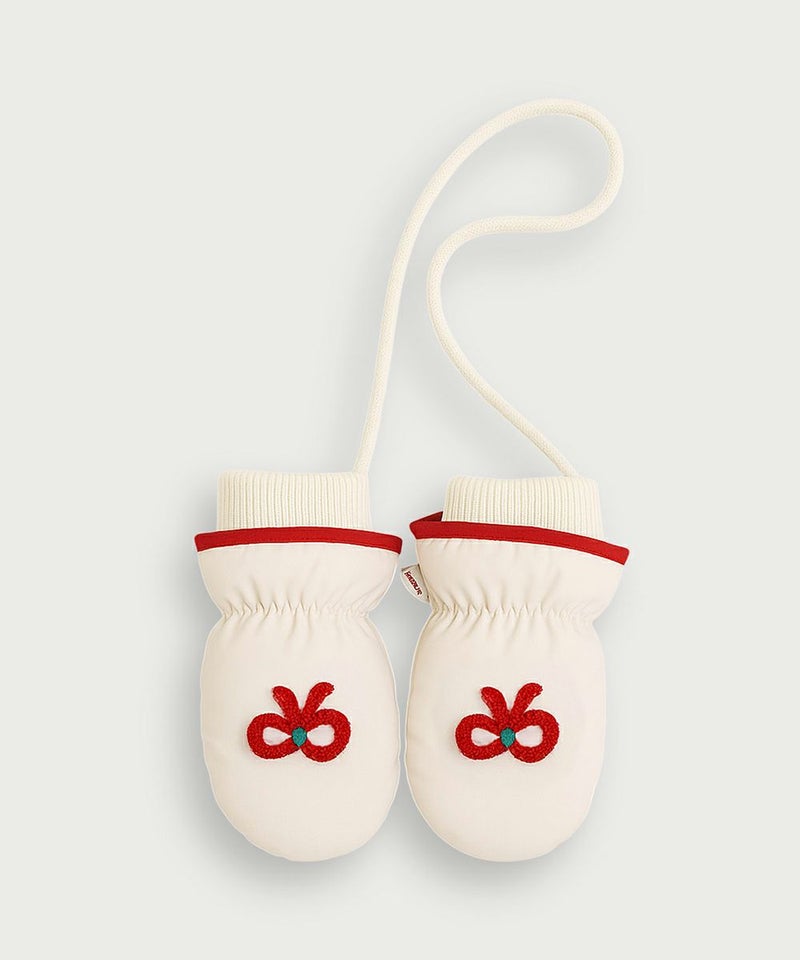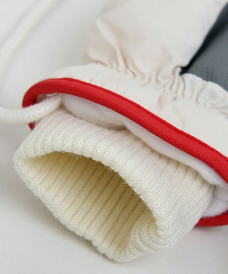 ソフトなアイボリーカラーに手首のレッドリボンのポイントで可愛らしさをプラスしたミトン。手首はリブを使用し、しっかり寒さを防止。手の平には滑り止めになる生地が付き、紛失防止のために紐が付いています。