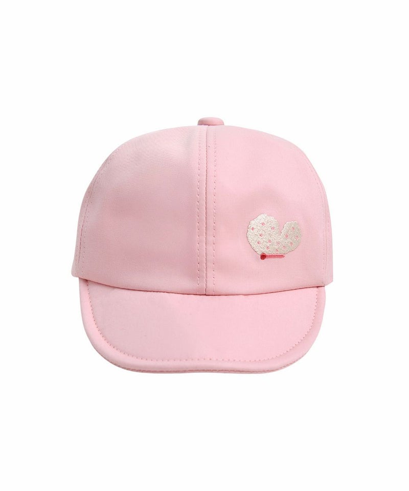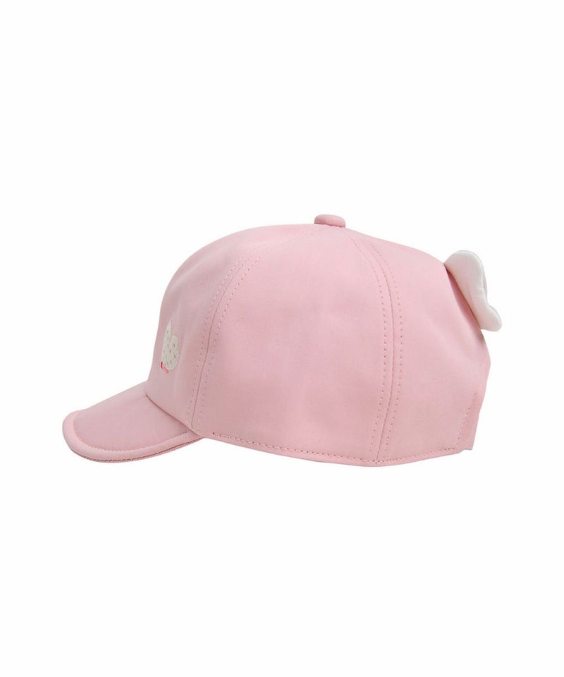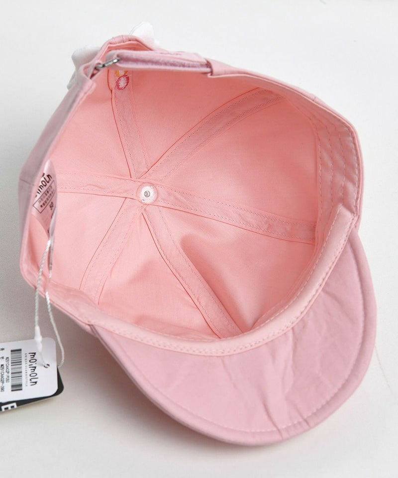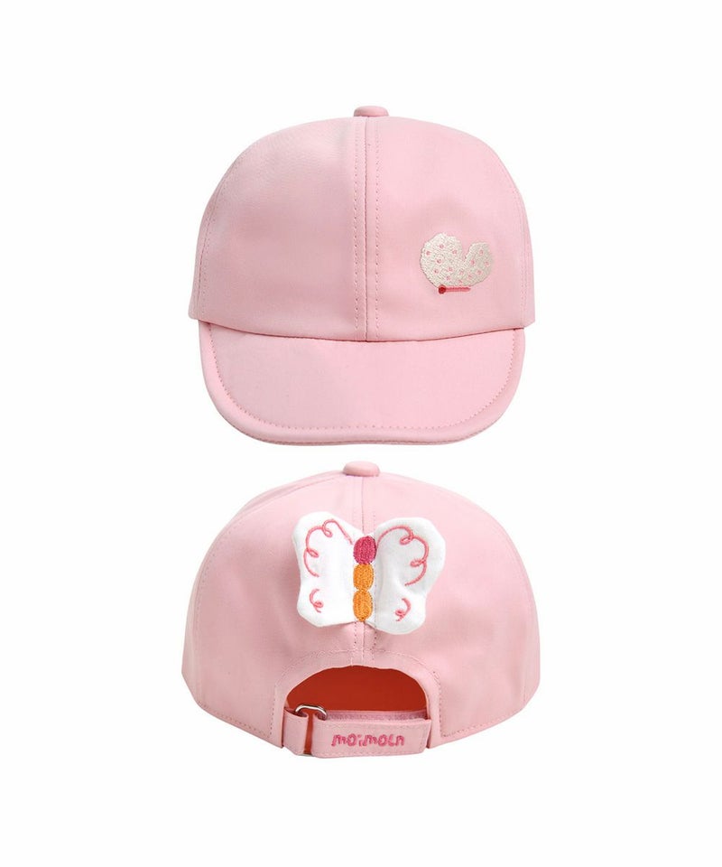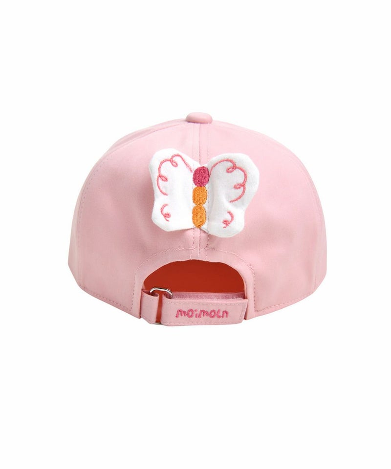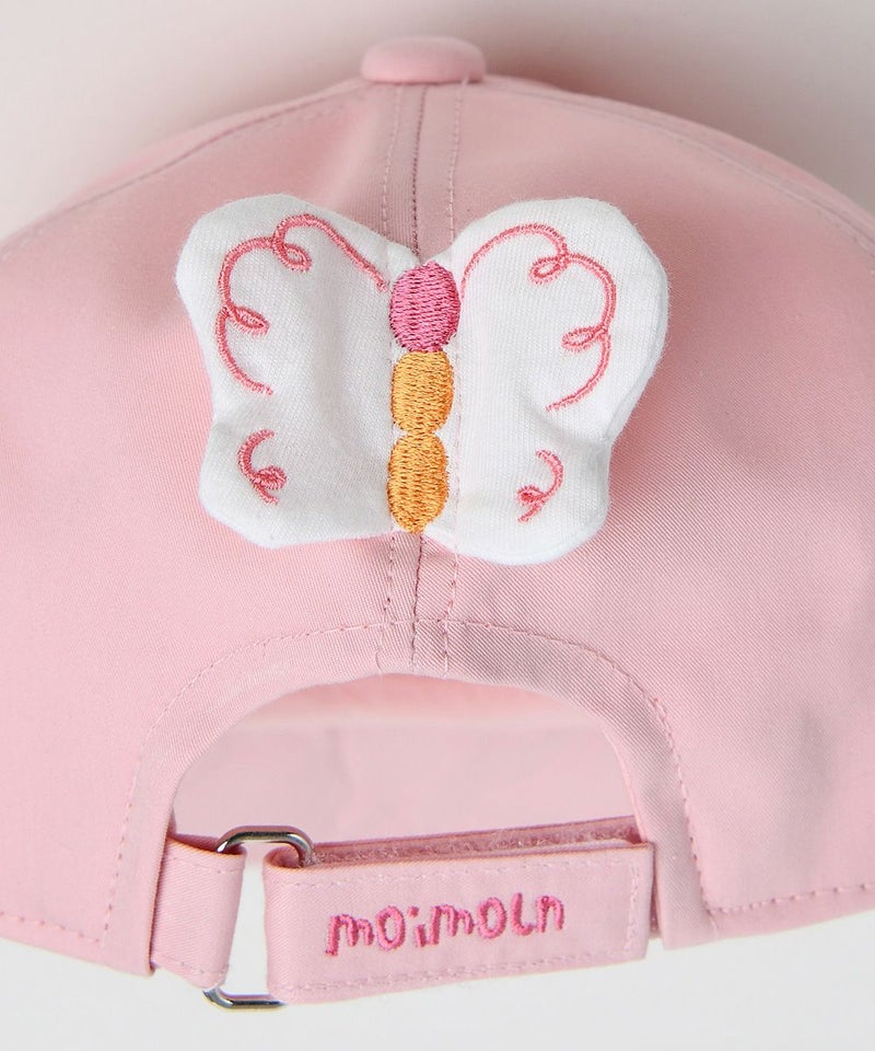 華やかなピンクカラーのソフトキャップ。帽子の後ろ側に蝶の形の飾りを付け、モイモルンならではのユニークな可愛らしさを表現したアイテムです。