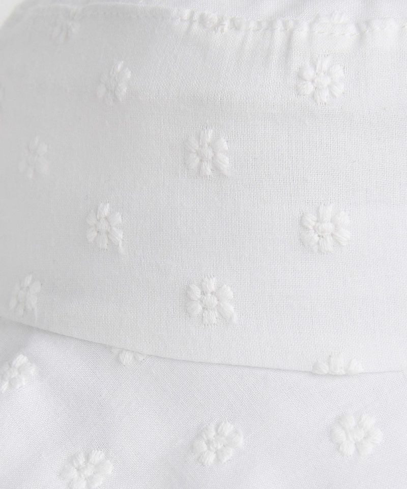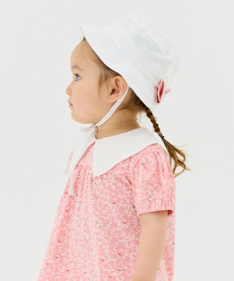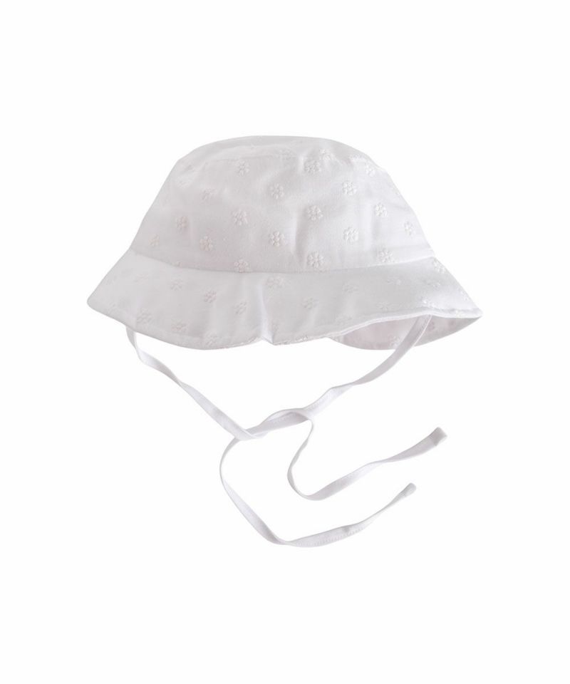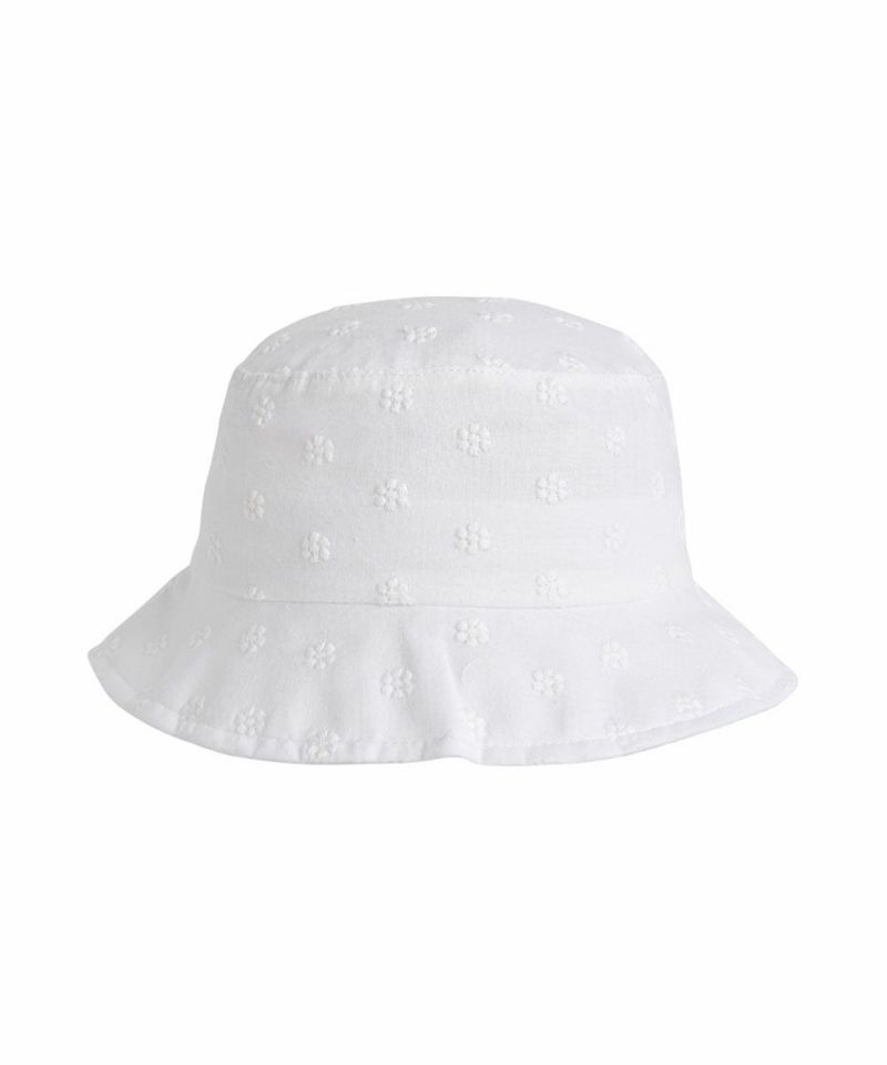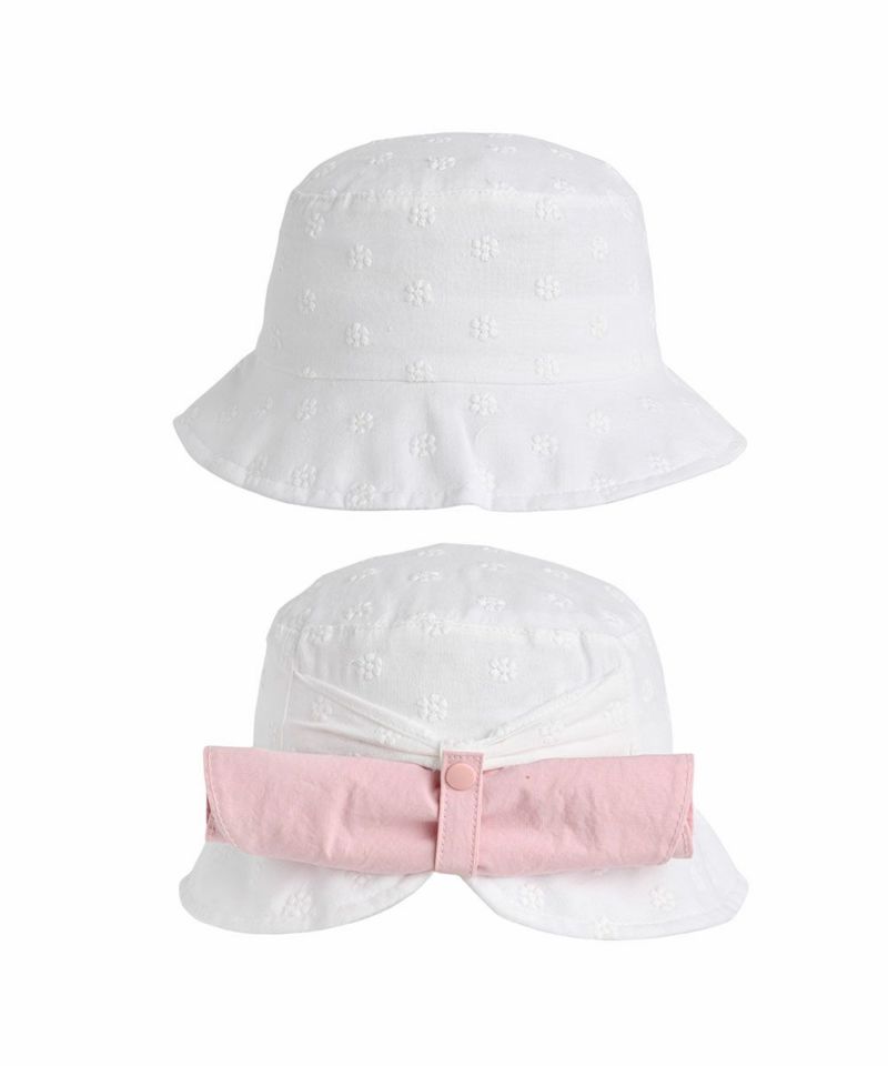コットン レースが混率されたベージックなホワイトカラーのコーディネートがしやすいハット。首の後ろを覆う日よけをロールアップしてスナップで固定する場合リボンの様なスタイルを楽しめる2WAYスタイリングが可能なアイテムです。
