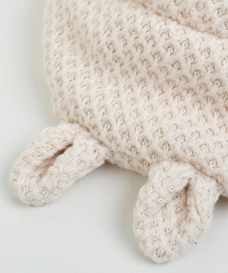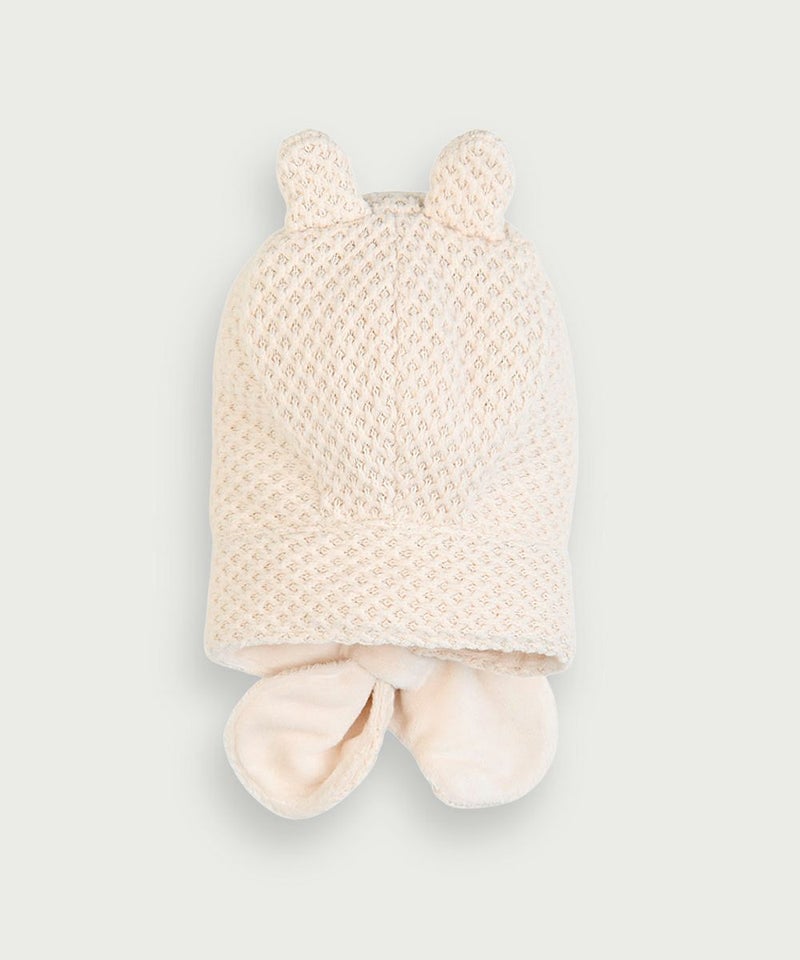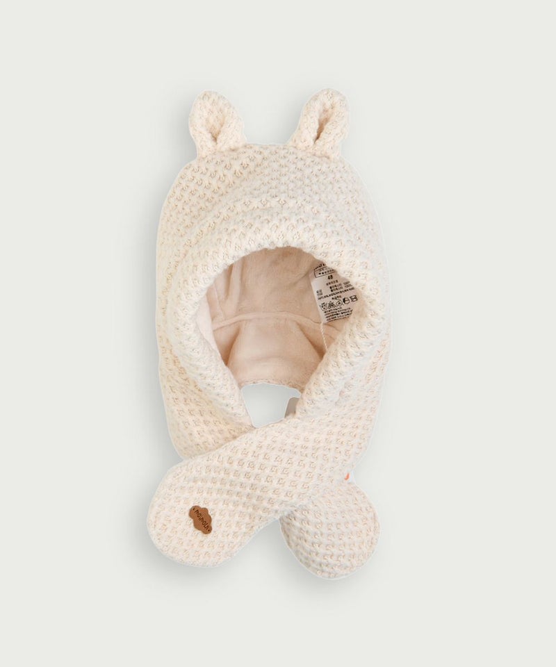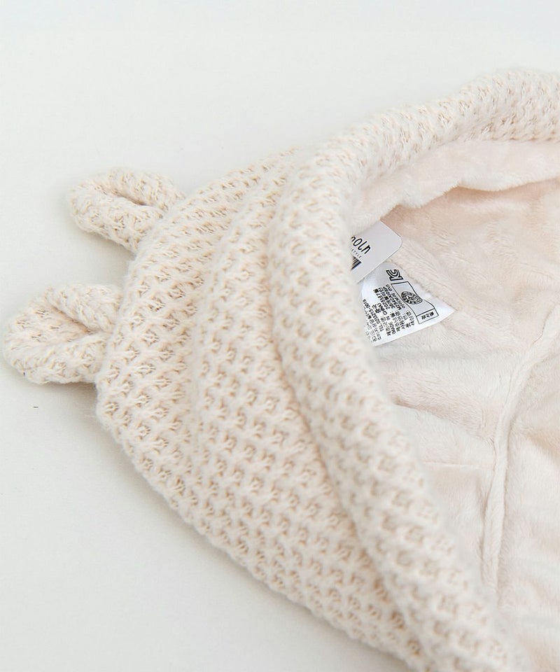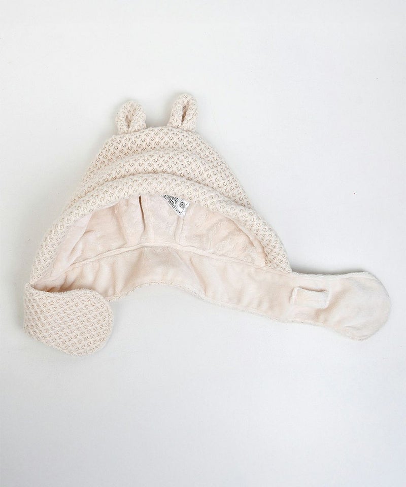 暖かみのあるニット素材の耳付き帽子。まるでマフラーがプラスされたような独特なデザインと、帽子の内側を全てポリエステルのファーをあしらい、暖かく防寒アイテムとしてぴったりアイテムです。