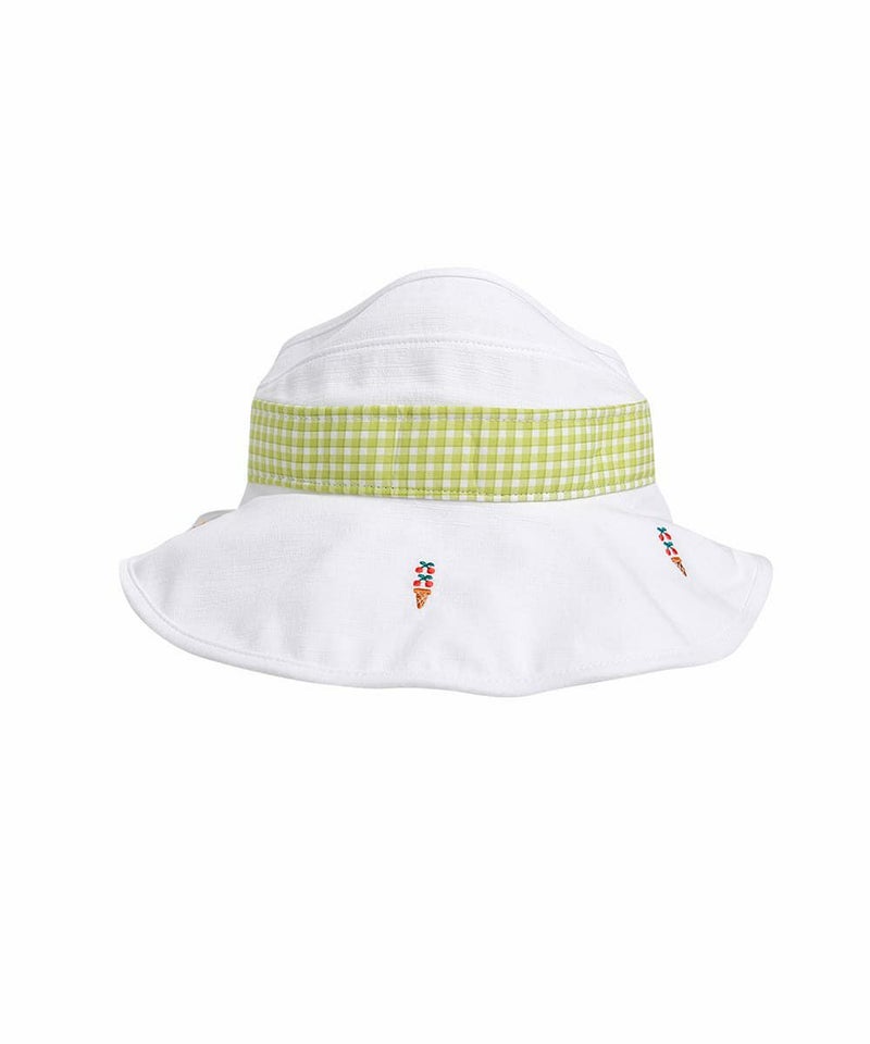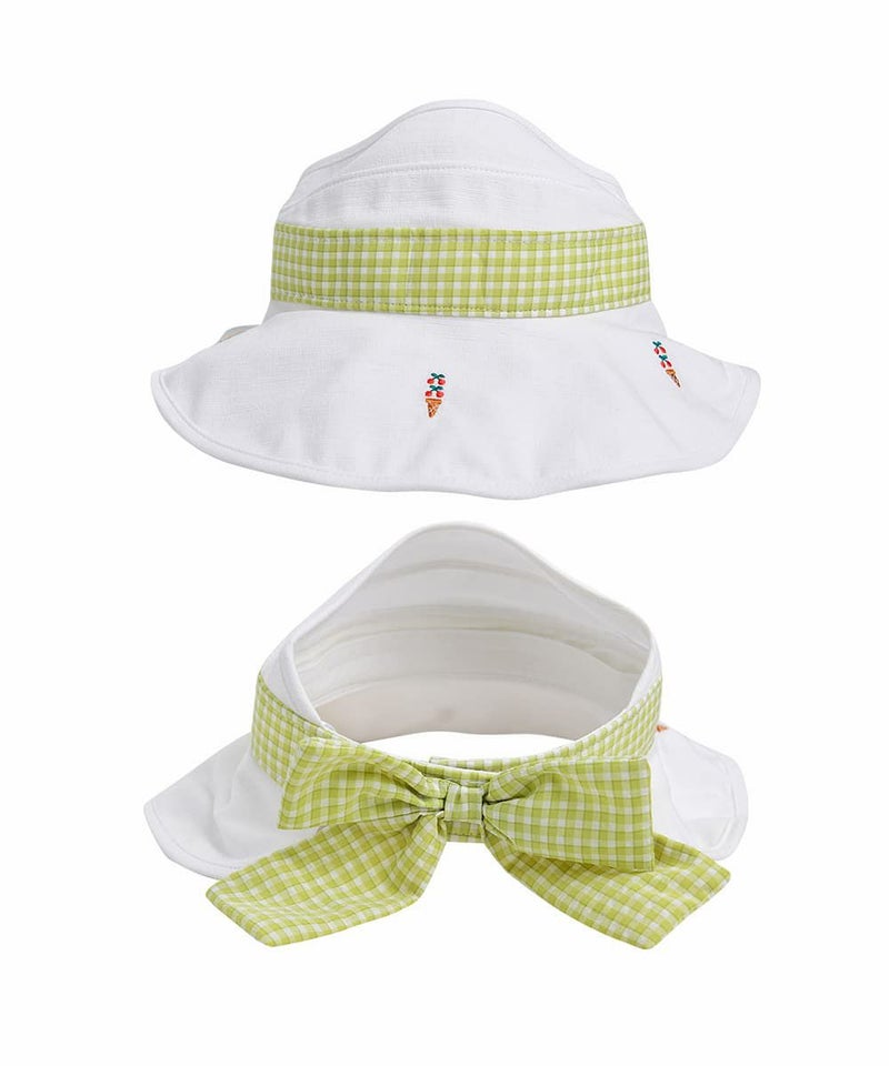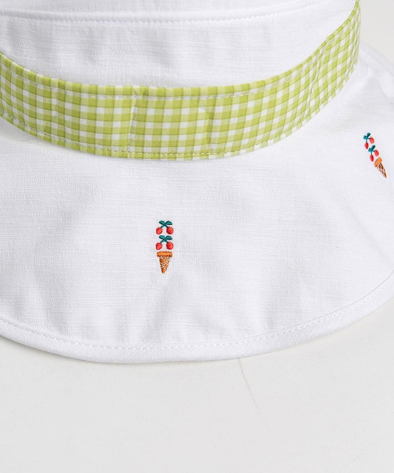 刺繍がポイントの広つばハット。日除け対策にピッタリのシルエット。飾りのチェック柄ウーブン素材リボンは、デザインとともにサイズ調節としても活躍します。本体をクルクル巻くことで、持ち運びにも便利なアイテムに仕上げました♪