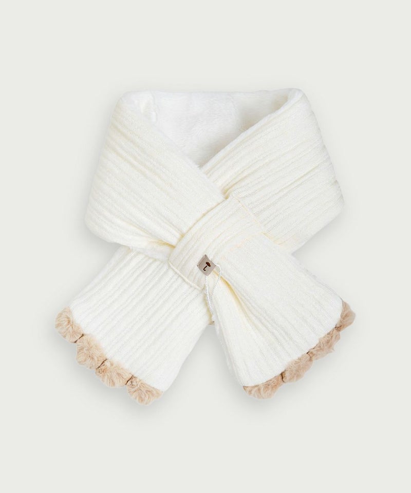 ケーブル組織のニット生地と内側のファーでスタイリッシュながら保温性も高いキッズマフラー。マフラーの先のミニポンポンがCuteなアクセントに、カラーも2カラーの組み合わせでさまざまなコーディネートしやすいアイテムです。