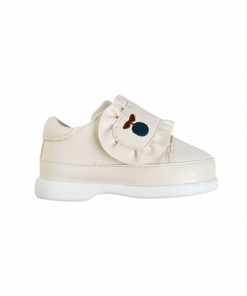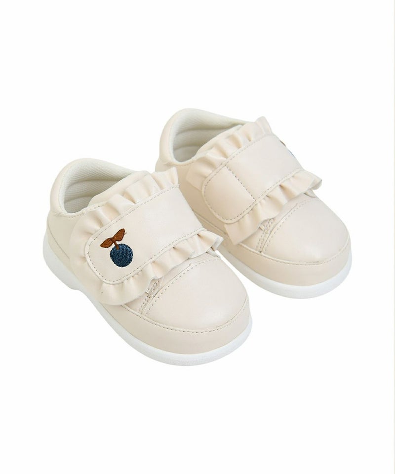 キュートなフルーツのベリー刺繍のスニーカータイプのメロディーシューズ。バンドにフリルをつけ、ラブリーな雰囲気に仕上げています。ベリーシリーズ(アウター M253JMB02P,セットアップ M253STB02P,M253STB13P,カバーオールセット M253ROB06P)とコーディネートしやすいアイテムです。125~135サイズ(12.5cm~13.5cm)のみメロディシューズ(音あり)となっています。