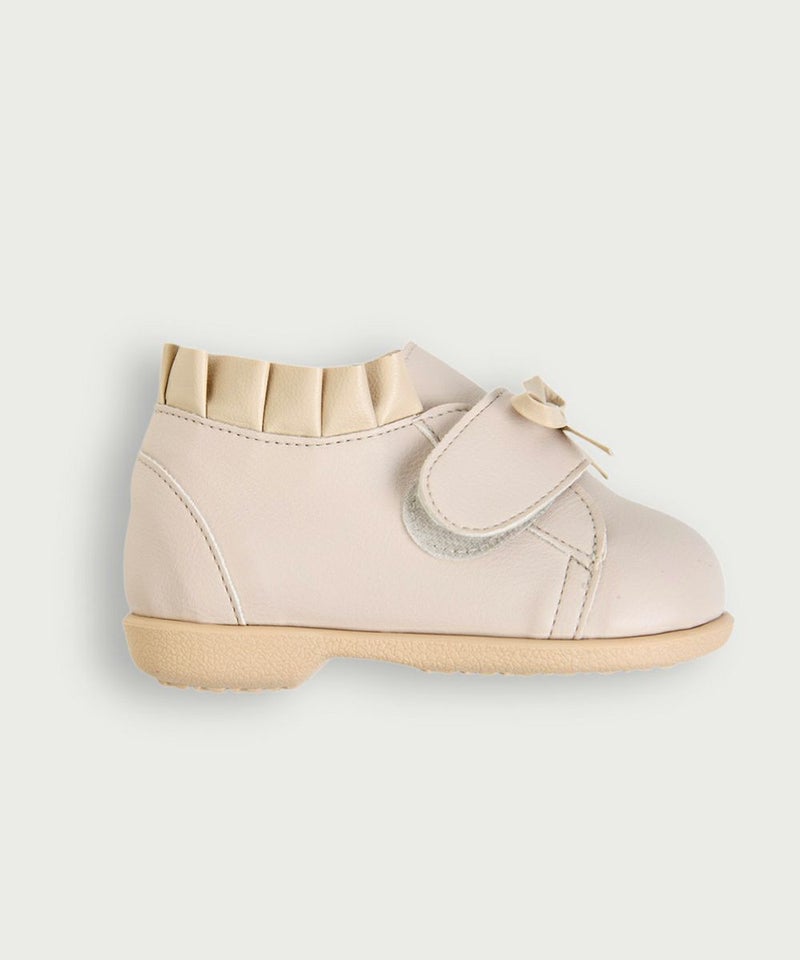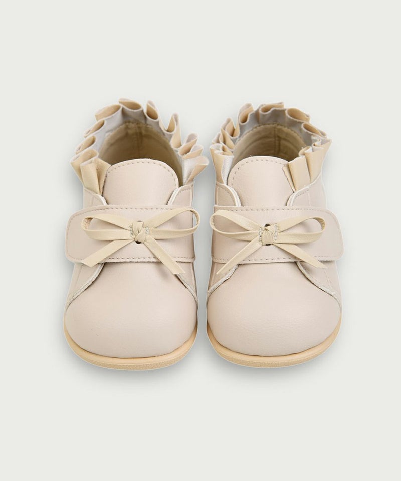 見えた目のソフトなアイボリーカラーのメロディシューズ。足首のプリーツディテール、フロントのリボンがラブリーなムードに。フロントの面ファスナーで脱着も簡単。内側にファスナーガードを付け、肌への刺激を防止しています。
