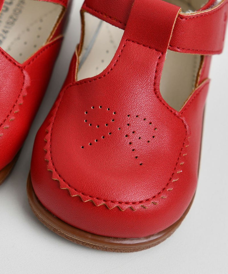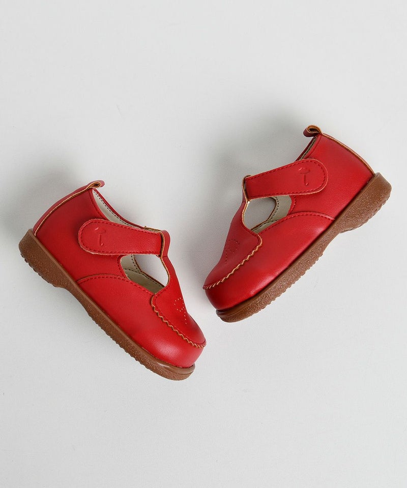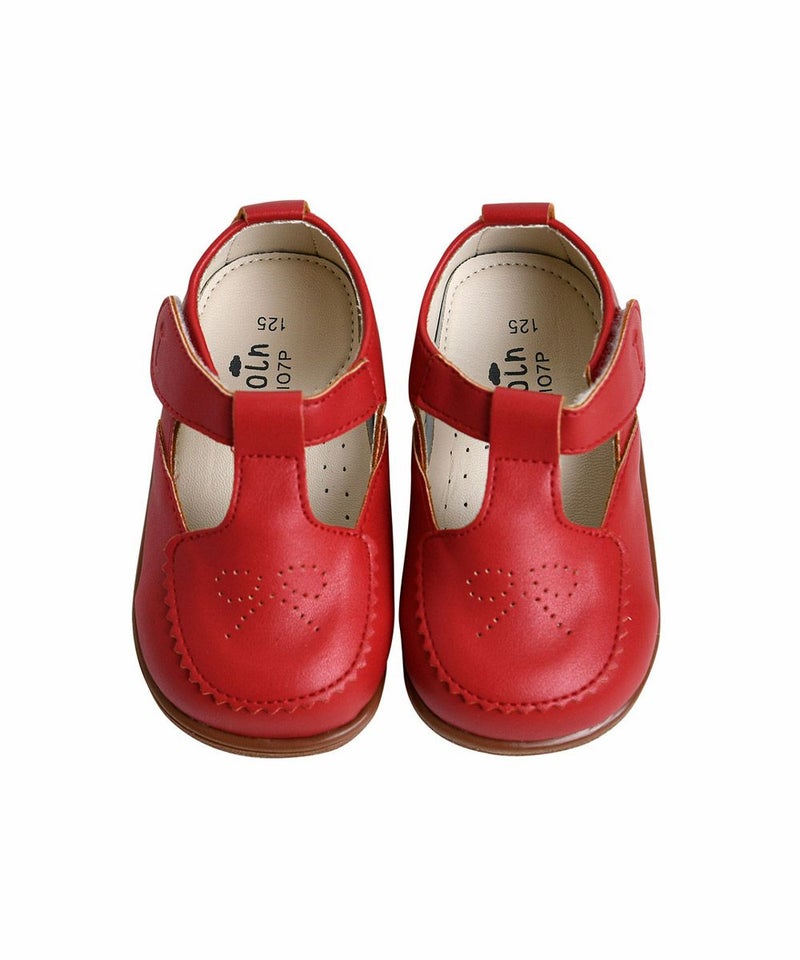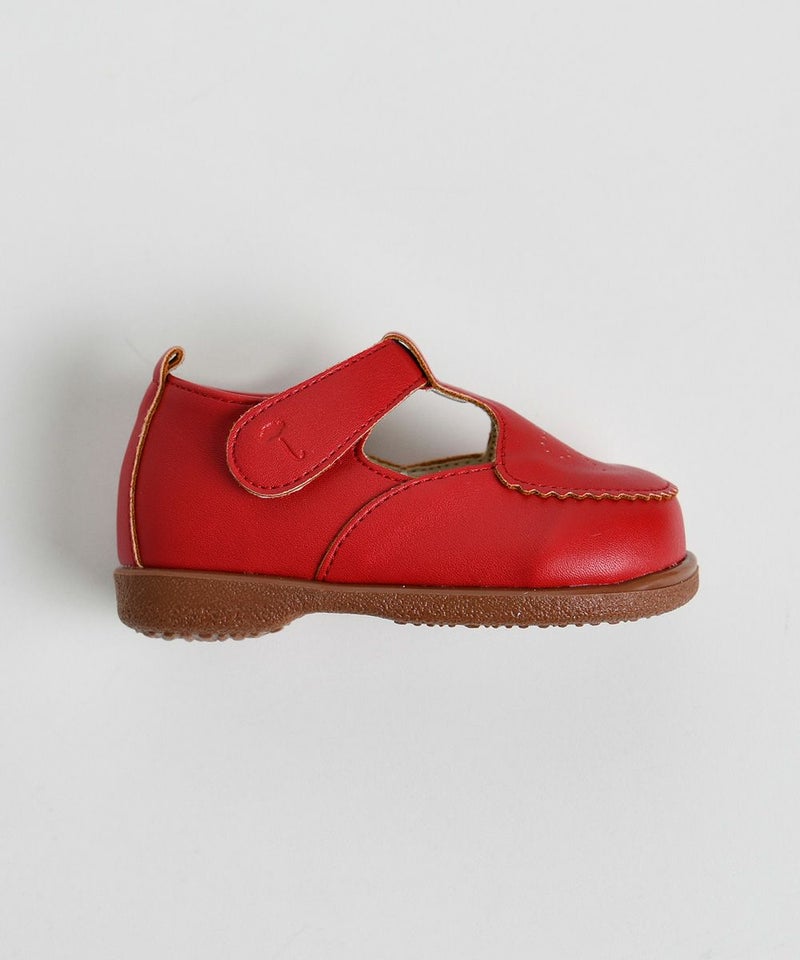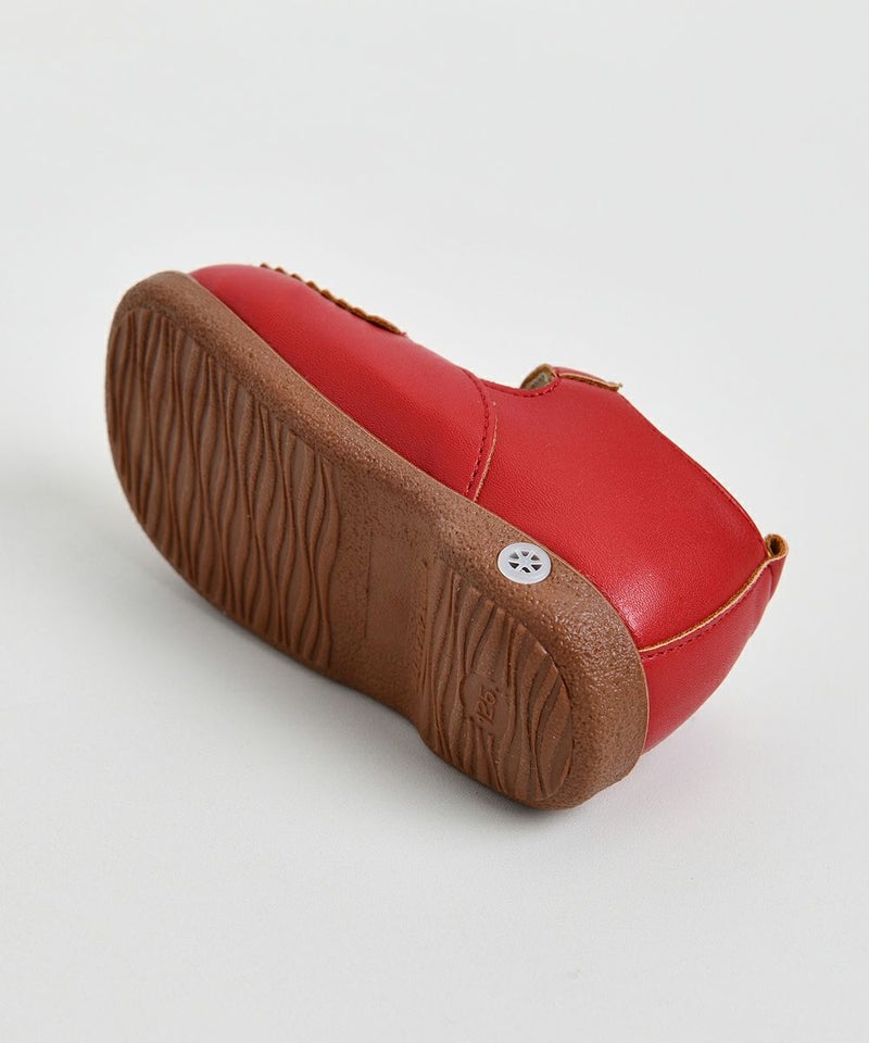 おしゃれなレッドカラー、スカラップ、リボンモチーフが特徴的なメロディーシューズ。蝶柄ニットカーディガン(W241GDB33P)、チェックフレアミニスカート(W241SKB41P)とのコーディネートがおすすめです。