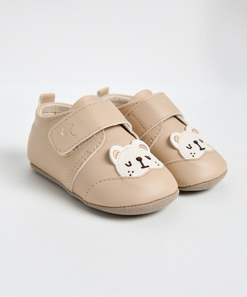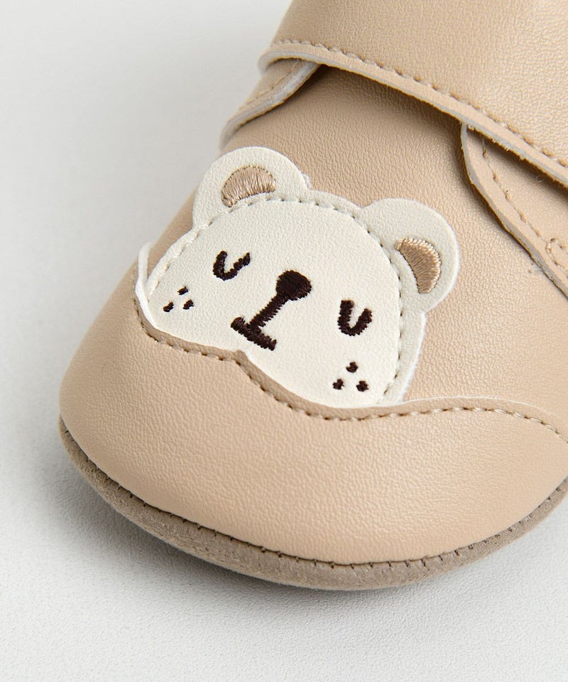ベーシックカラーの靴型ベビーシューズ。クマモチーフで可愛らしく、マルチコーデが楽しめるアイテムです。
