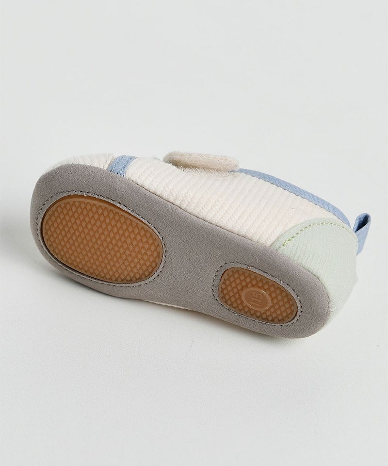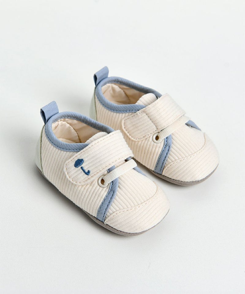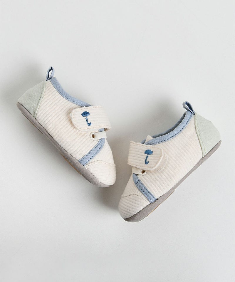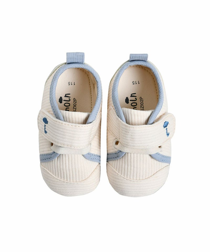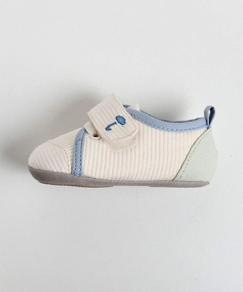 きれいなアイボリーカラーに水色のパイピングで配色したベビーシューズ。ベーシックなカラーなので、どんなコーデにも似合うアイテムです。