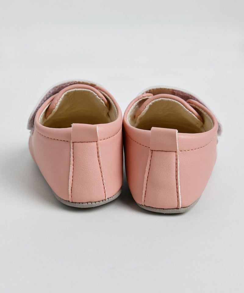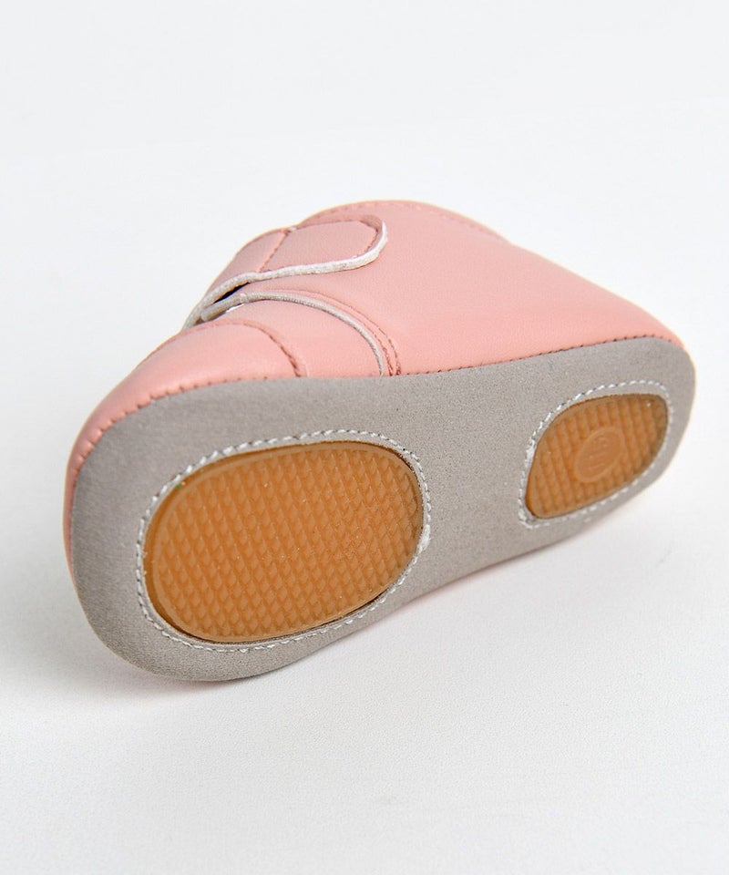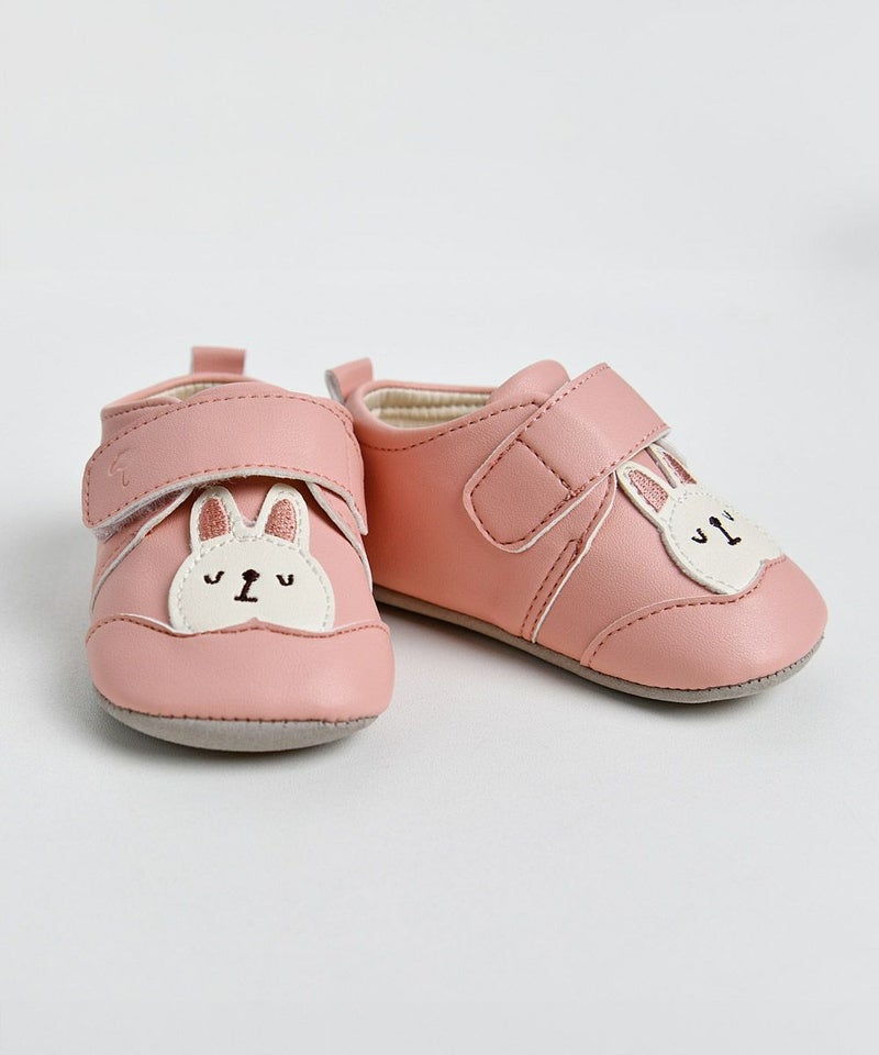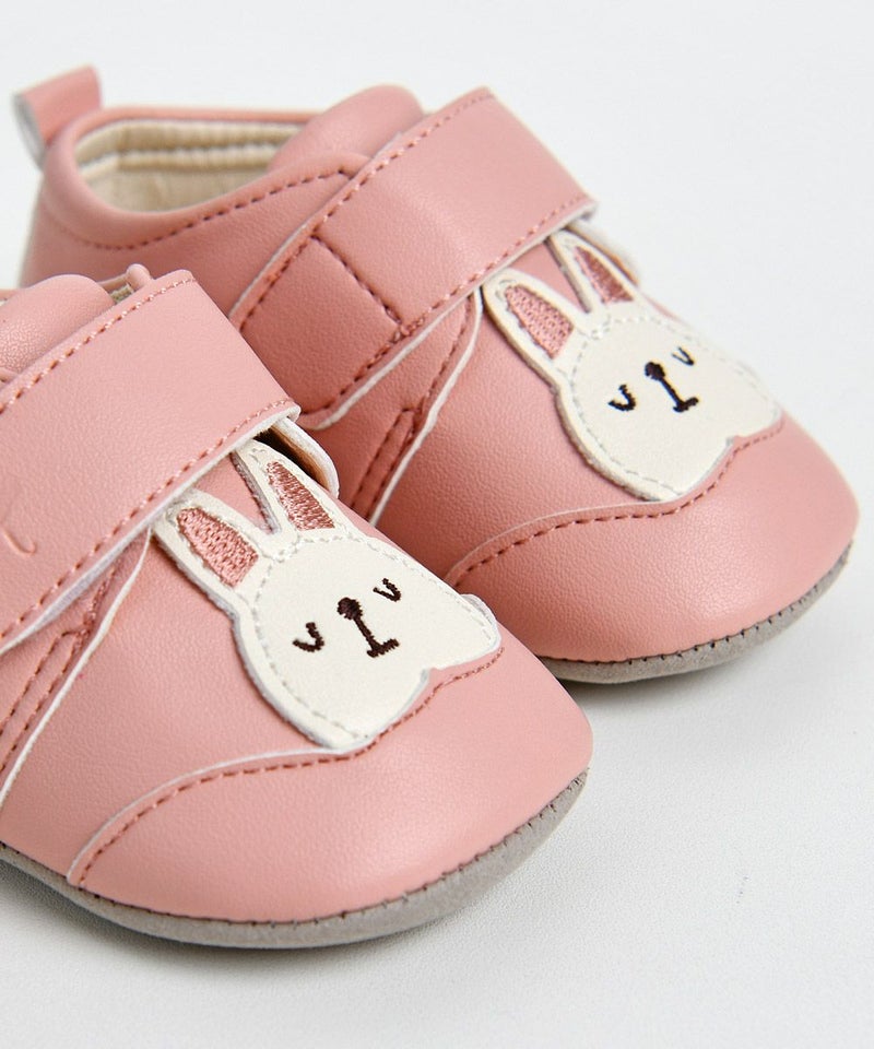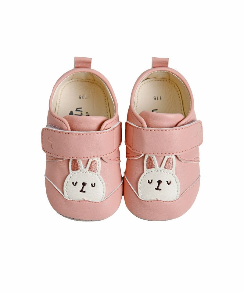 落ち着いたピンクトーンのベビーシューズ。ウサギのモチーフが可愛さを演出し、カジュアルなコーディネートに最適なアイテムです。