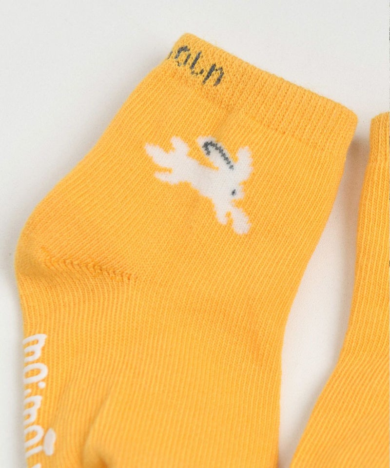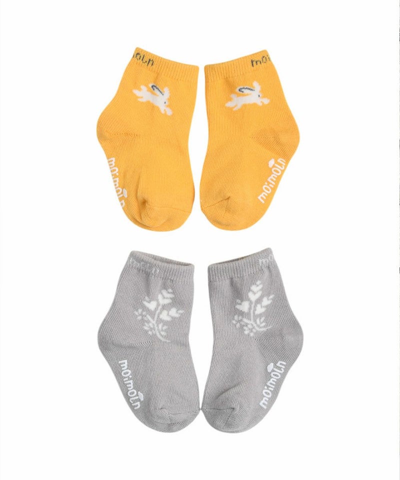 遊び回るウサギがポイントの可愛らしいマスタードカラーと落ち着いた雰囲気のグレーカラーの靴下で構成されたソックス2枚セット。ワンピースやオーバーオールとの相性が良いアイテムです。