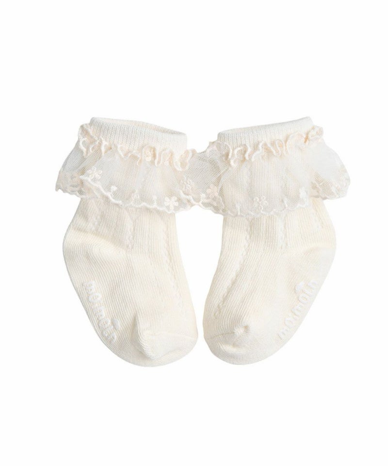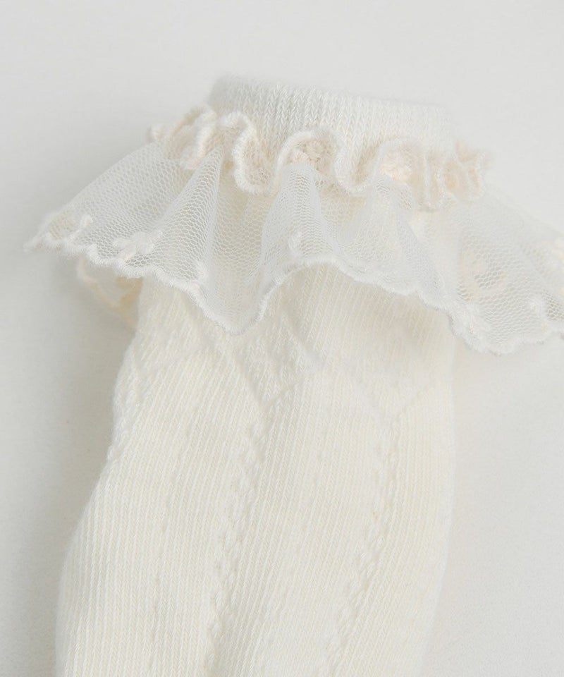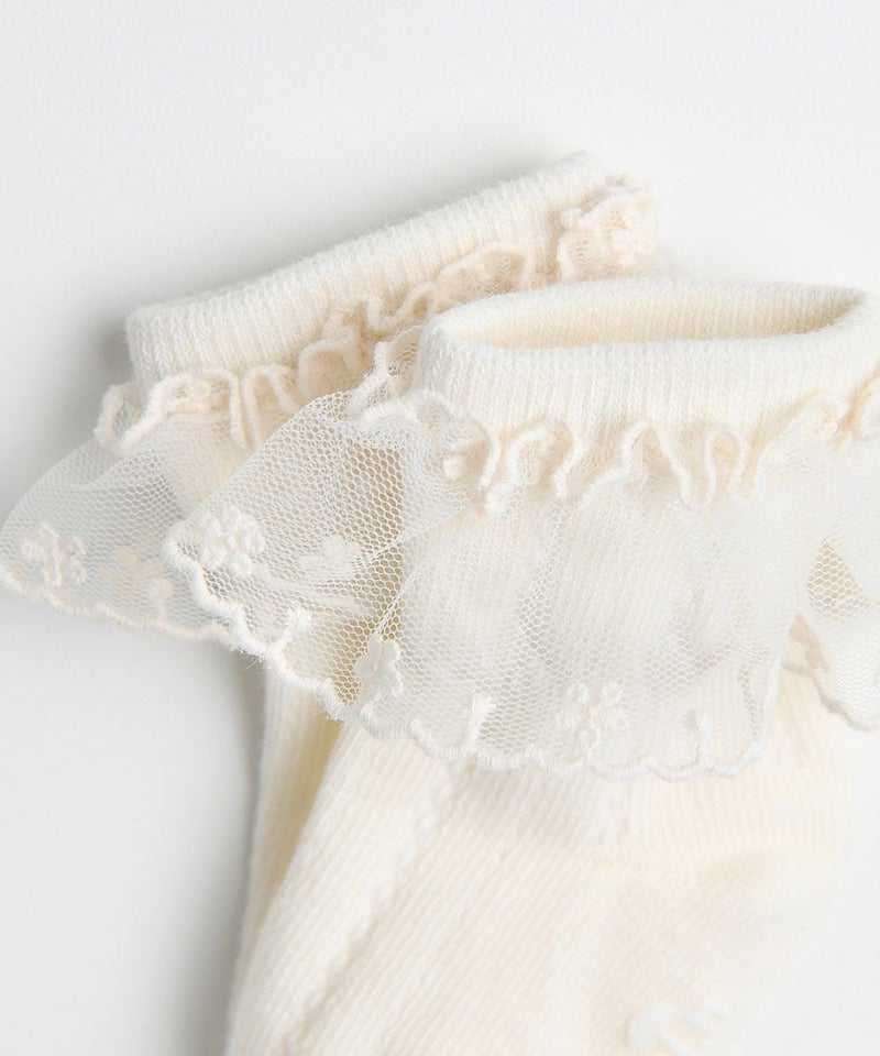 シアーなレース飾りが女の子らしさを引き立たせるソックス。ワンピース、ブルマなどとのマルチコーディネートがおすすめのアイテムです。