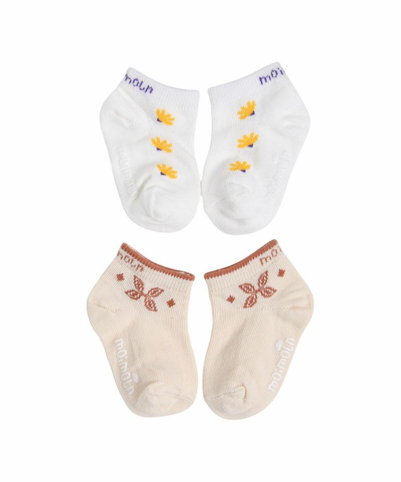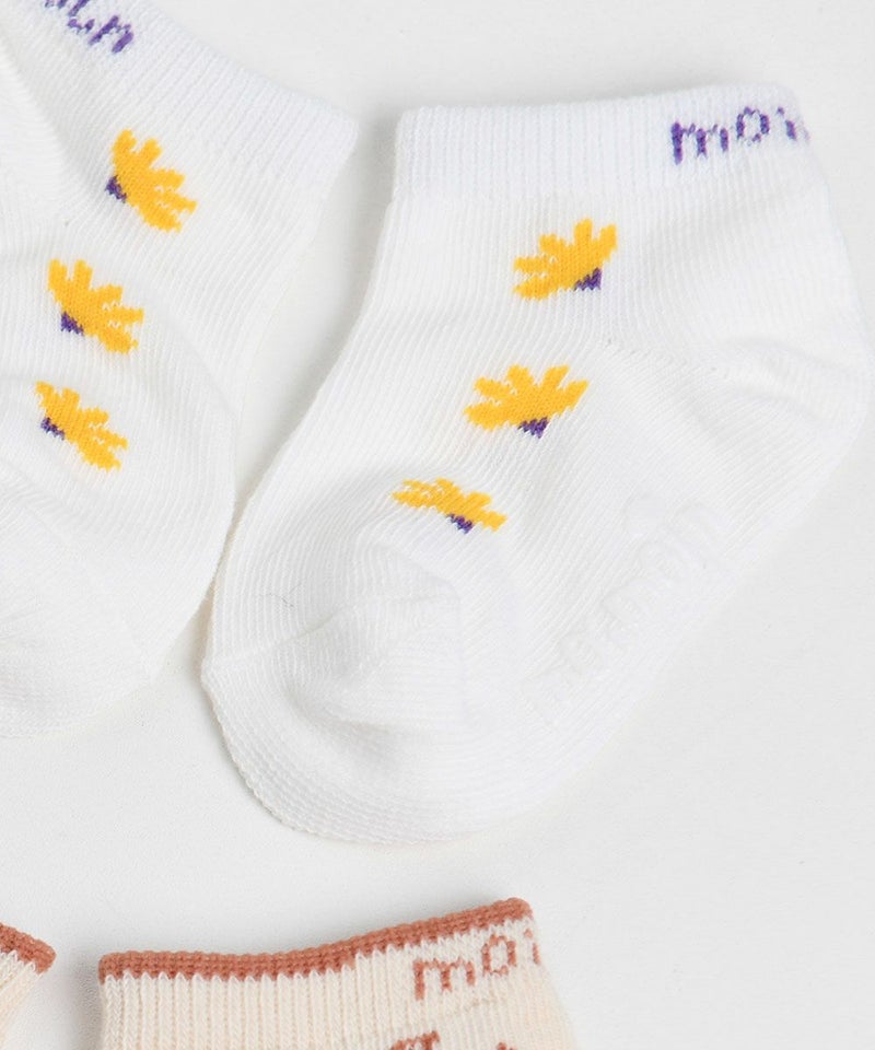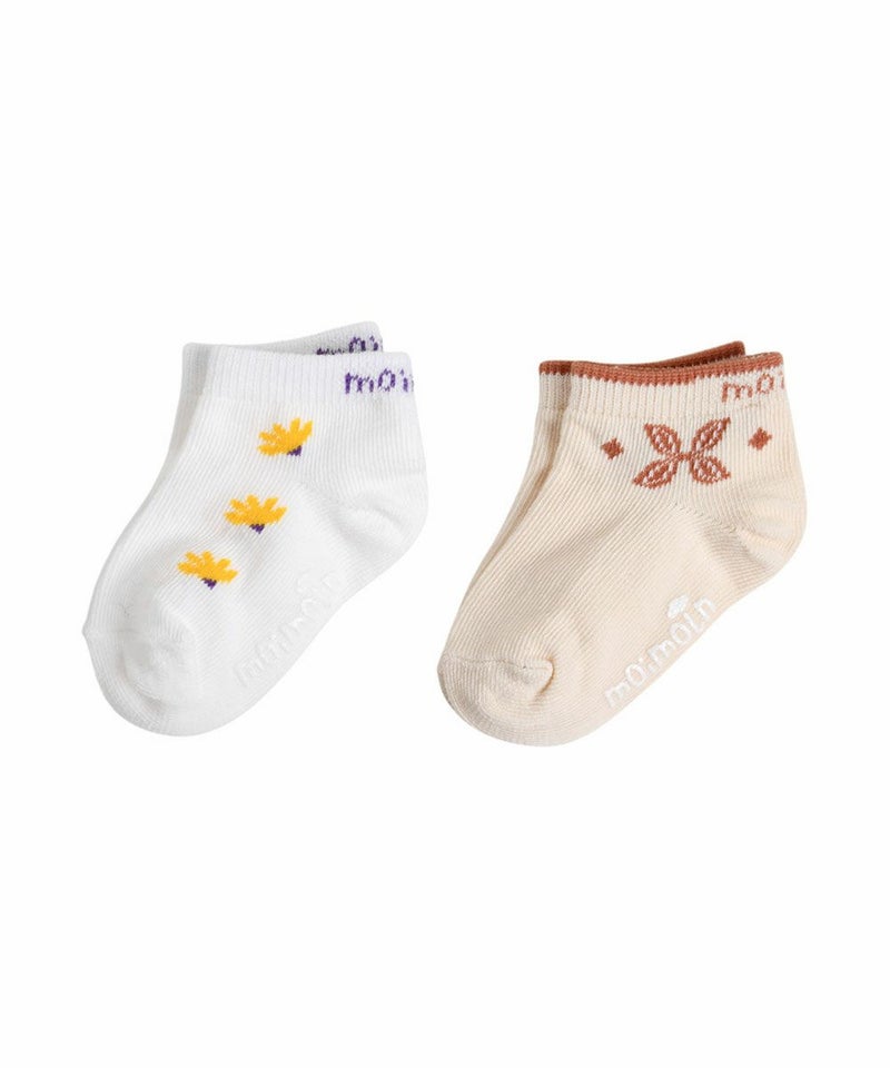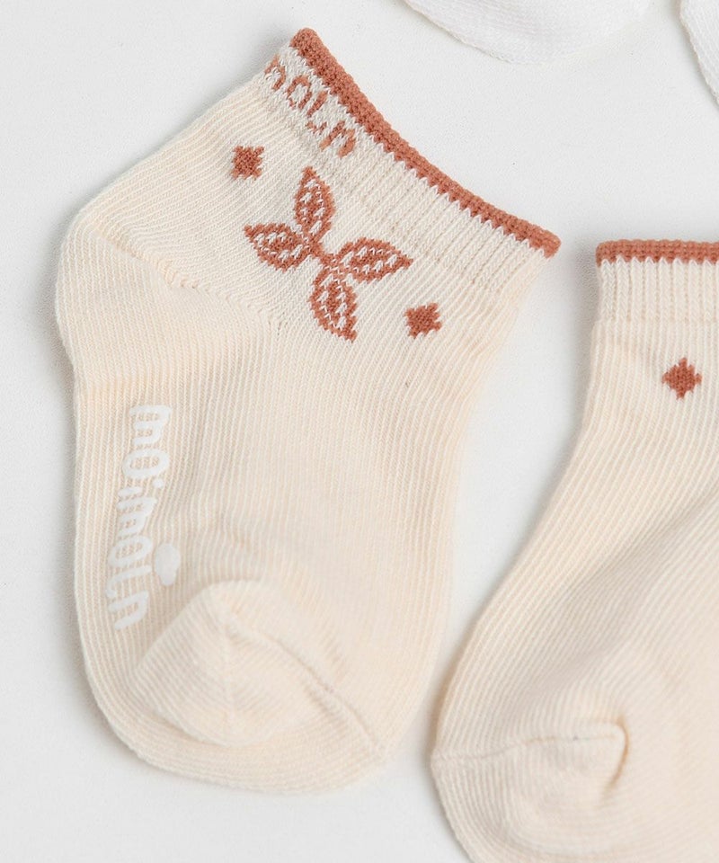 シーズングラフィックに使われたお花がポイントで入った足首丈のスニーカーソックスセット。地色がアイボリー、クリームなので基本的に活用度の高いアイテムです。