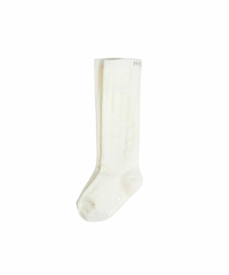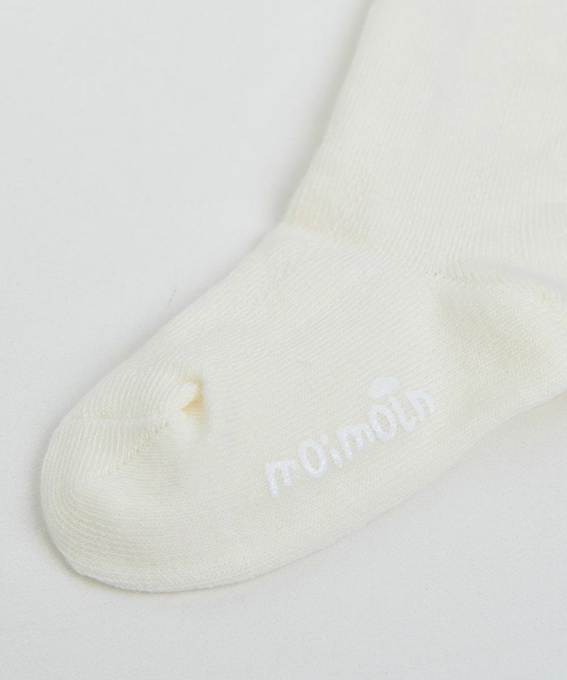 履いた時のほのかなダイヤ柄編みがポイントのひざ下丈の靴下。口ゴム付近にはmoimolnロゴ、足の裏には滑り止めがついており、小さなお子様にぴったり。とてもシンプルなので様々なコーディネートに使えるアイテムです。