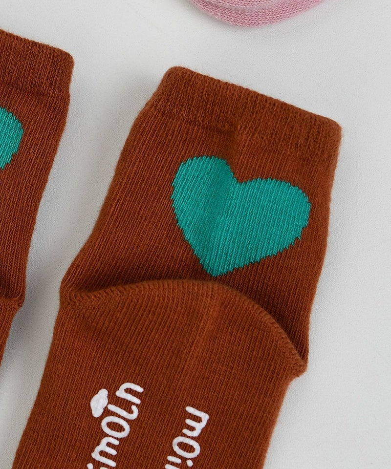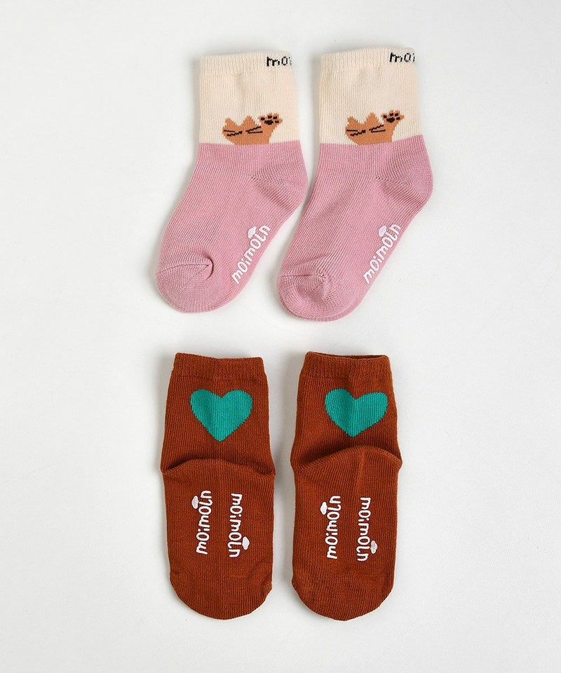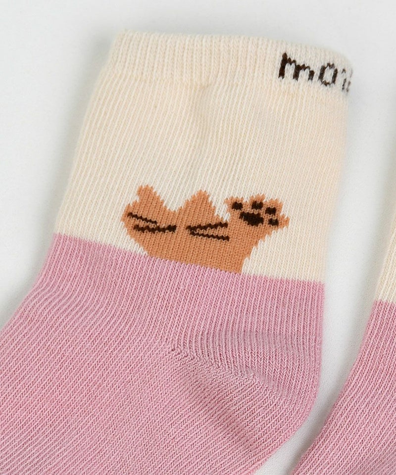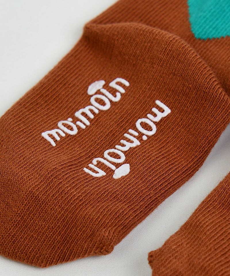 個性あふれる3足SETのひざ下丈ソックス。デザインとしてmoimolnロゴをプラス、足の裏にはブランドロゴの滑り止めがついており、小さなお子様にぴったり。かわいいキノコ、ネコのミャオ(meow)、ユニークなカラー配色のストライプで構成され、お互い違うムードのデザインが様々なコーデにマッチします。