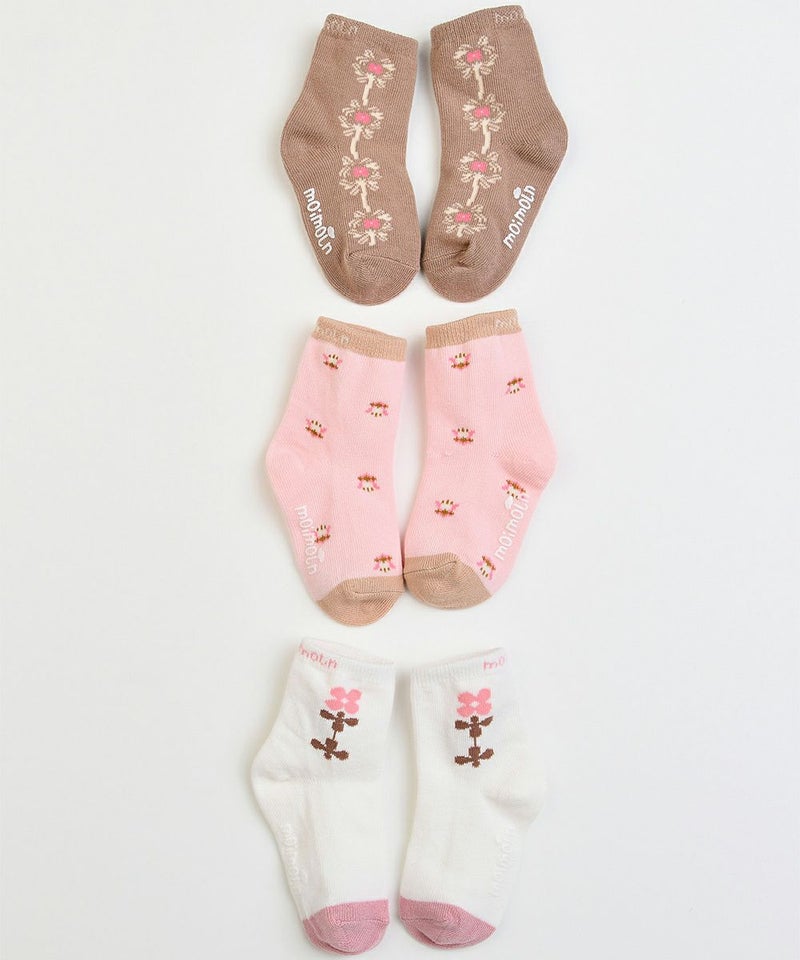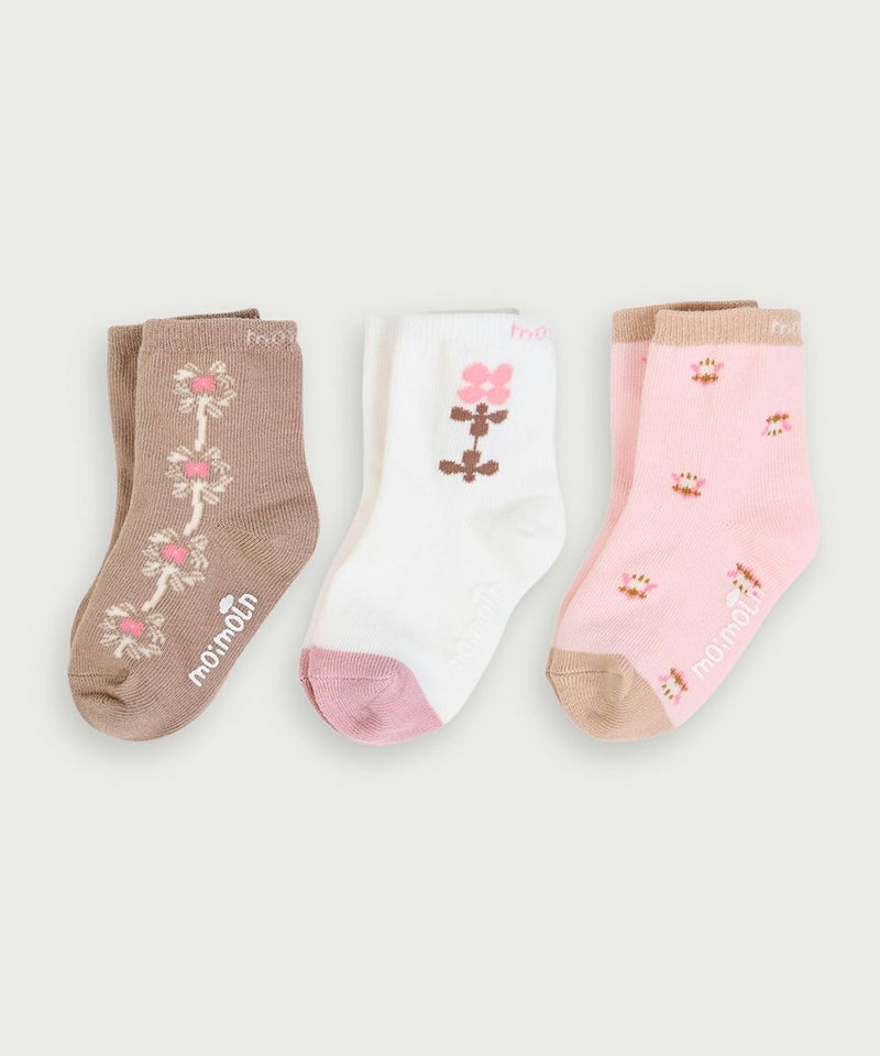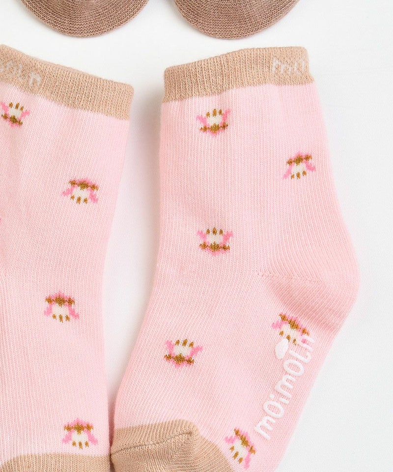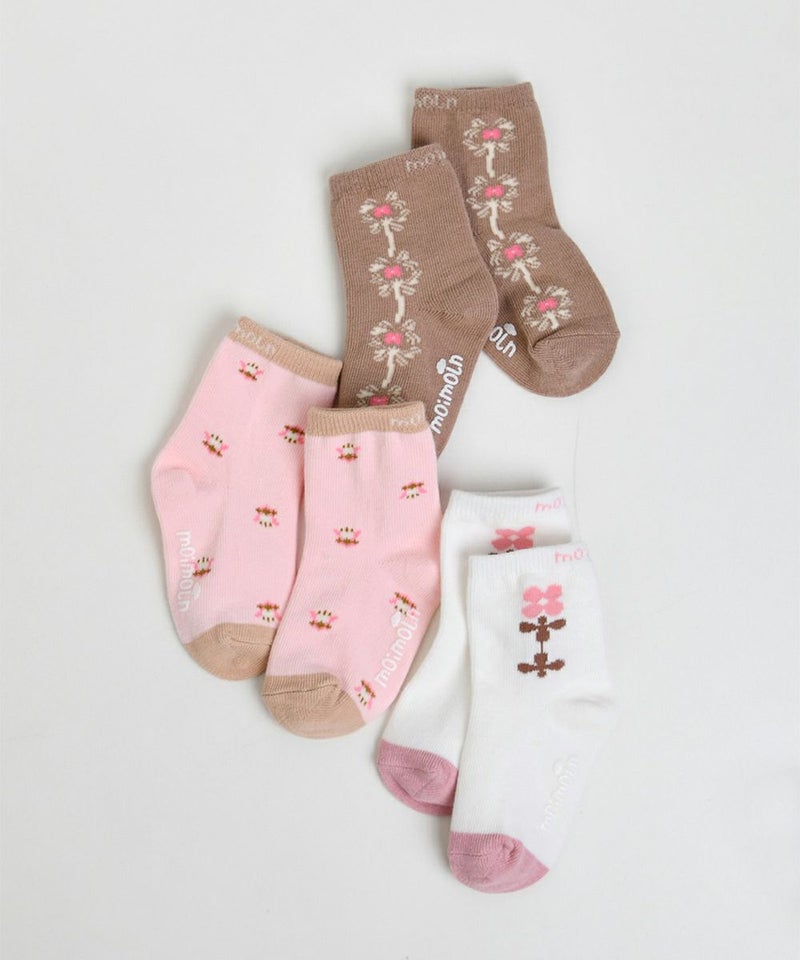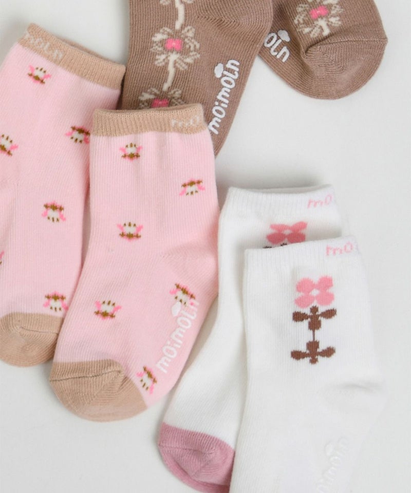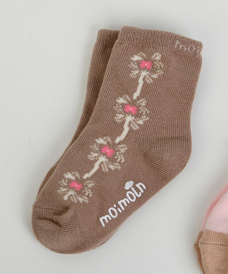 異なるデザインのお買い得な3足SETの膝下丈ソックス。デザインとしてmoimolnロゴをプラス、足の裏にはブランドロゴの滑り止めがついており、小さなお子様にぴったりです。
