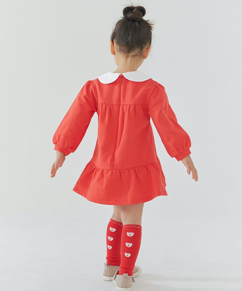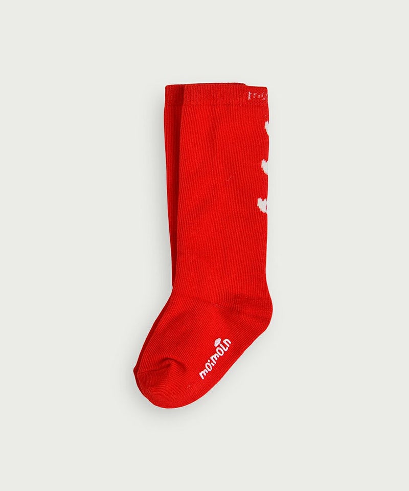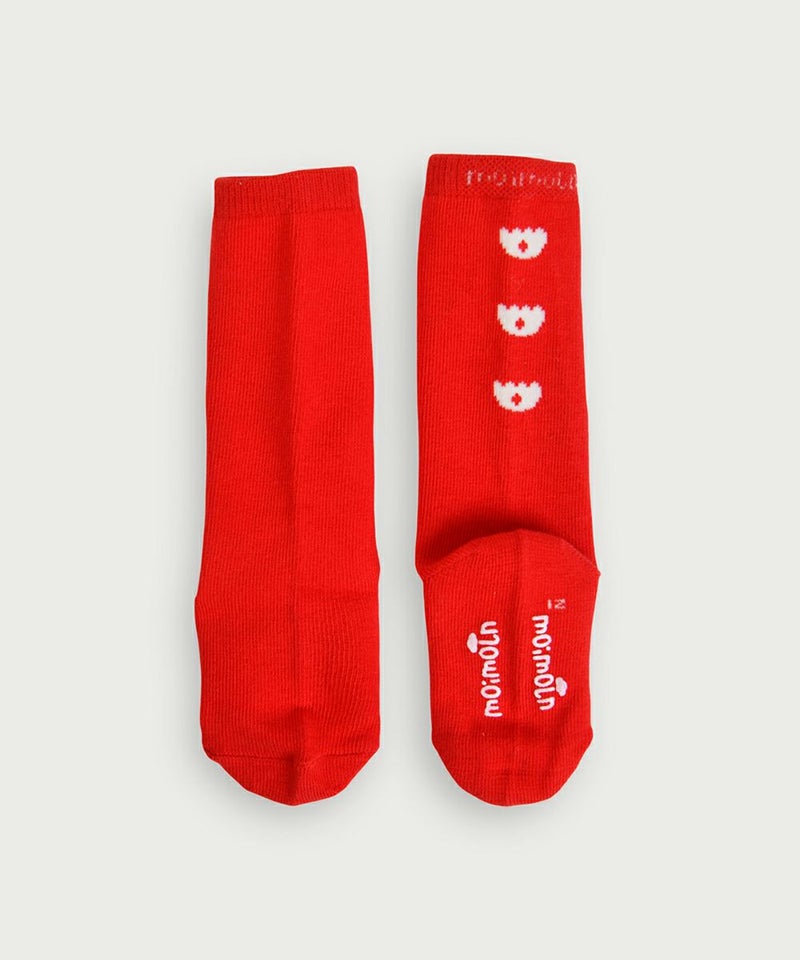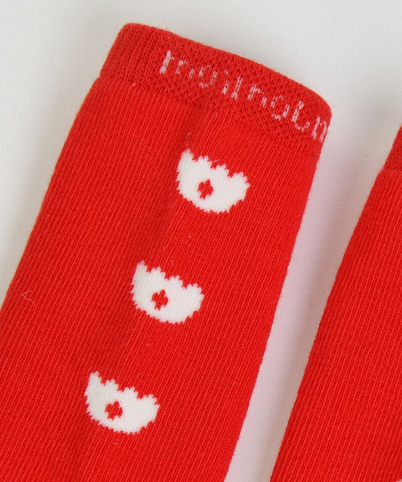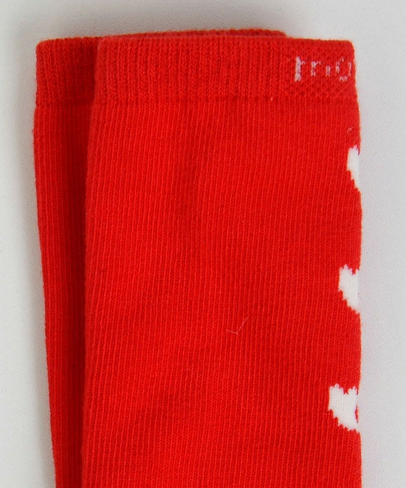 映えるレッドカラーにチューリップマークをあしらった膝下丈の靴下。