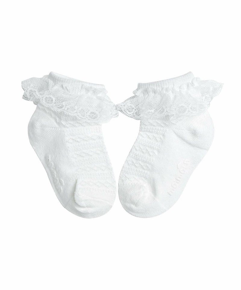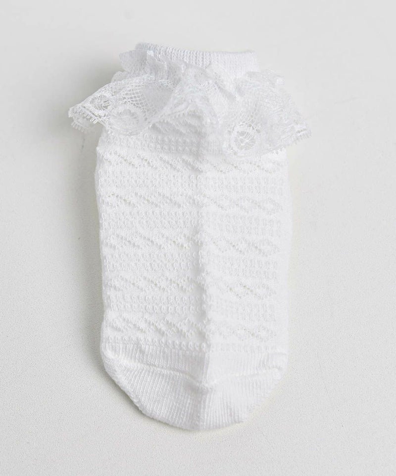 足首のレースがポイントの女の子らしい可愛いジャガードソックス。レース部分でぐっと女の子らしさがUPする便利アイテムです。