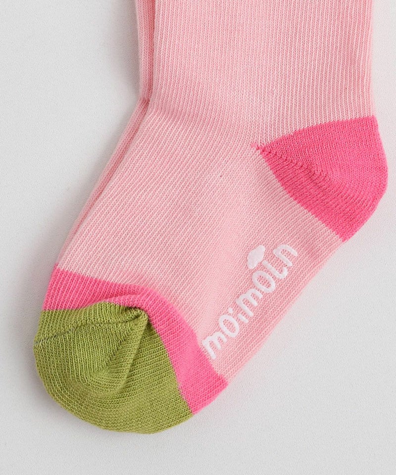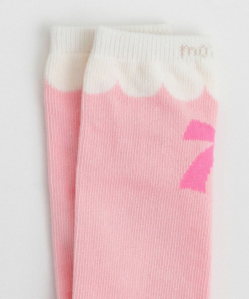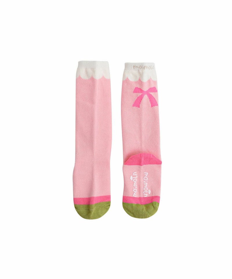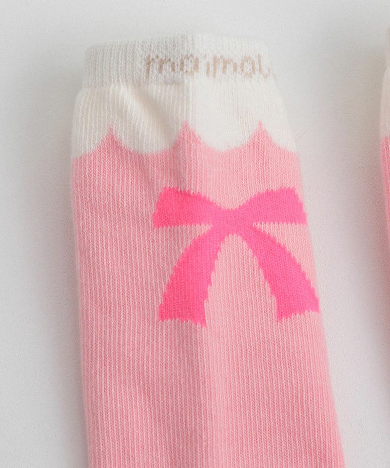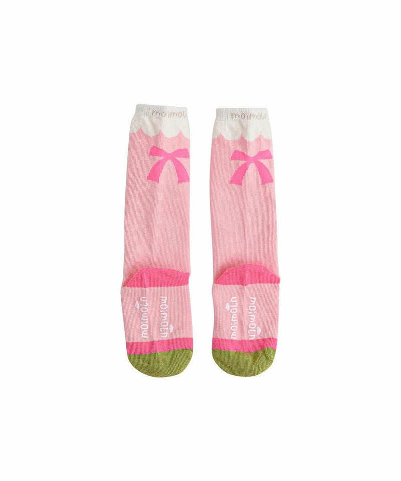 リボンモチーフのソックス。女の子らしい配色と大きなリボン柄がでかわいさを引き立たせます。