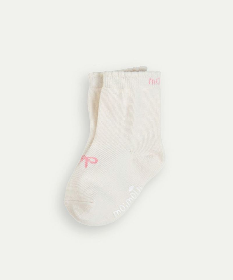 使い勝手の良いタイツのようなフィット感のあるレギンスとリボンモチーフがかわいいひざ下靴下のセット。靴下にはさりげないブランドロゴをあしらい、更に足の裏にはmoimolnロゴの滑り止めがついており、小さなお子様にぴったり。オムツの上からでもすっきり見えるようなヒップ部分のラインを意識したデザインでワンピースなどとのコーデもおすすめです。