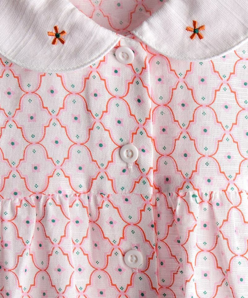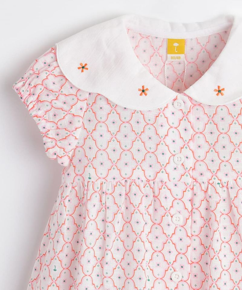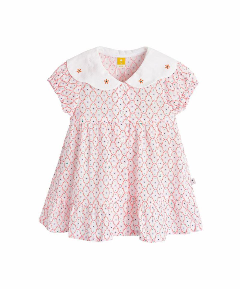 襟の形が可愛く刺繍がポイントの小花柄ワンピース。夏にぴったりの涼しげな印象で女の子らしいアイテムです。