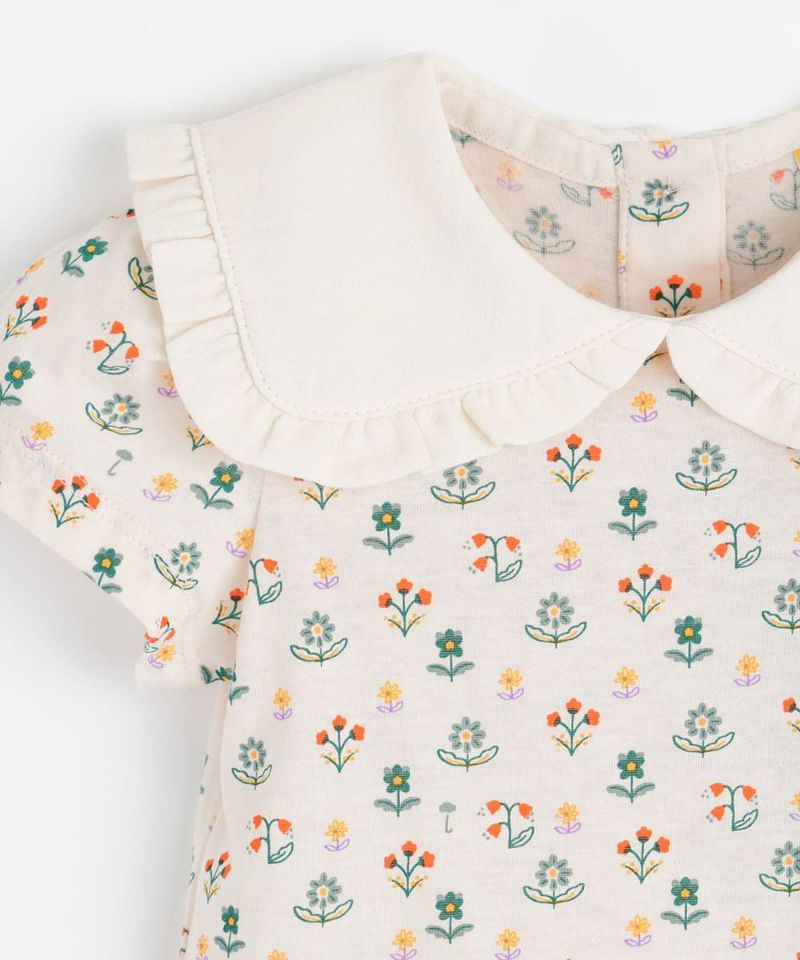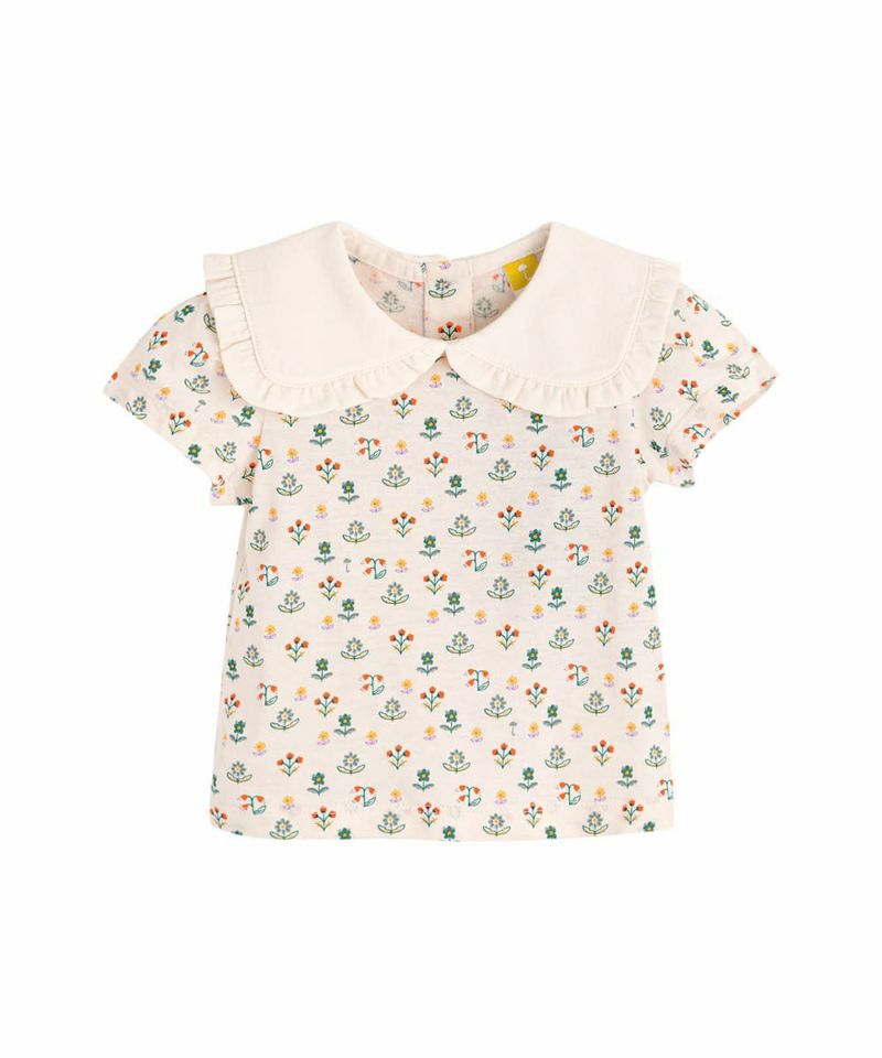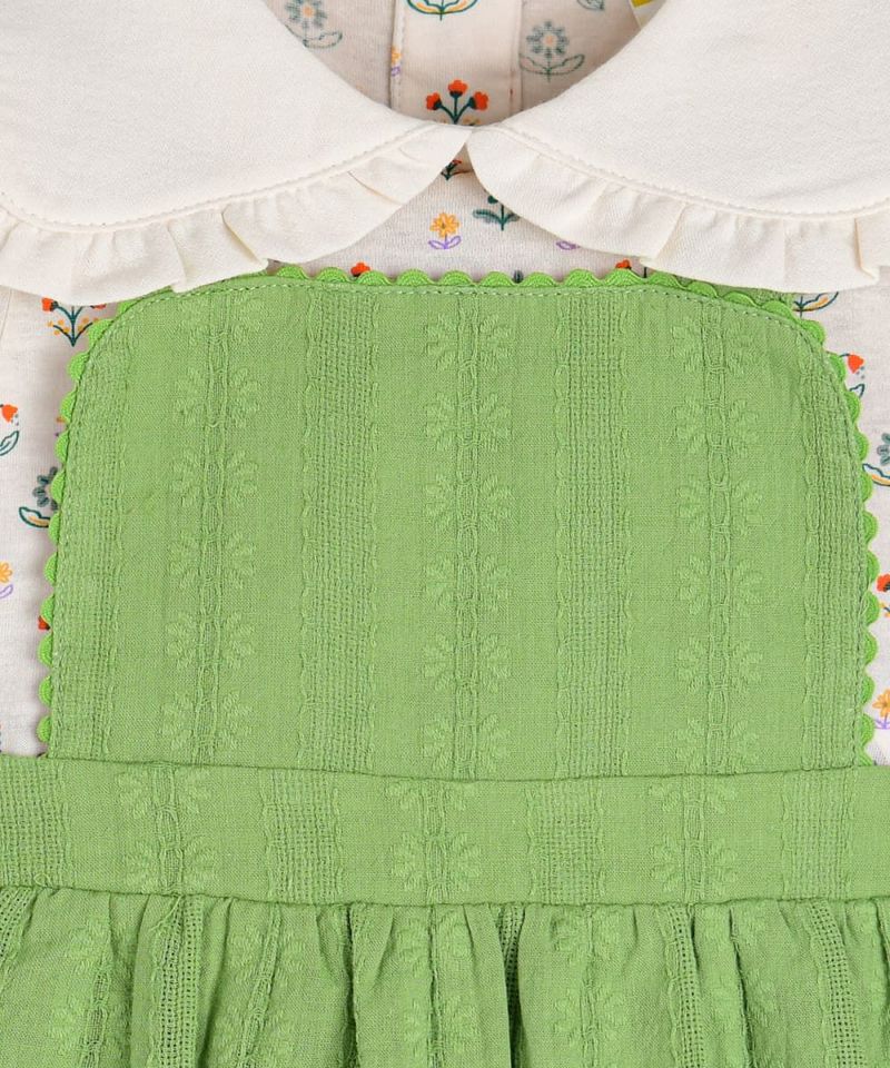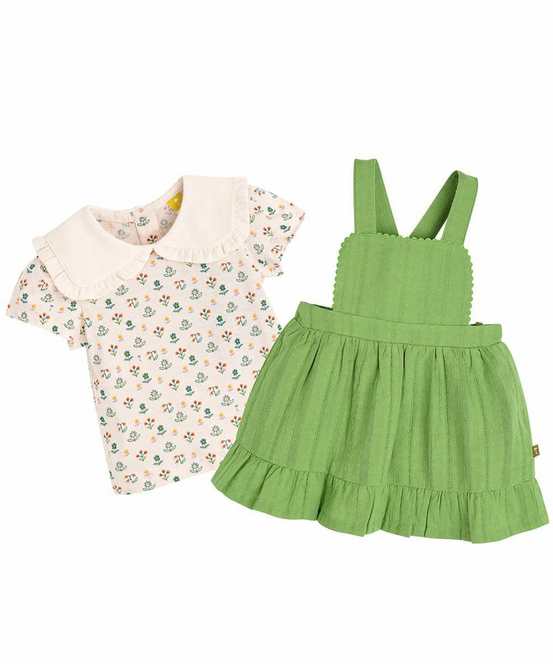襟付きトップスとオーバーオールスカートがセットになった1枚。配色が可愛くひらひらとしたシルエットもポイントです。