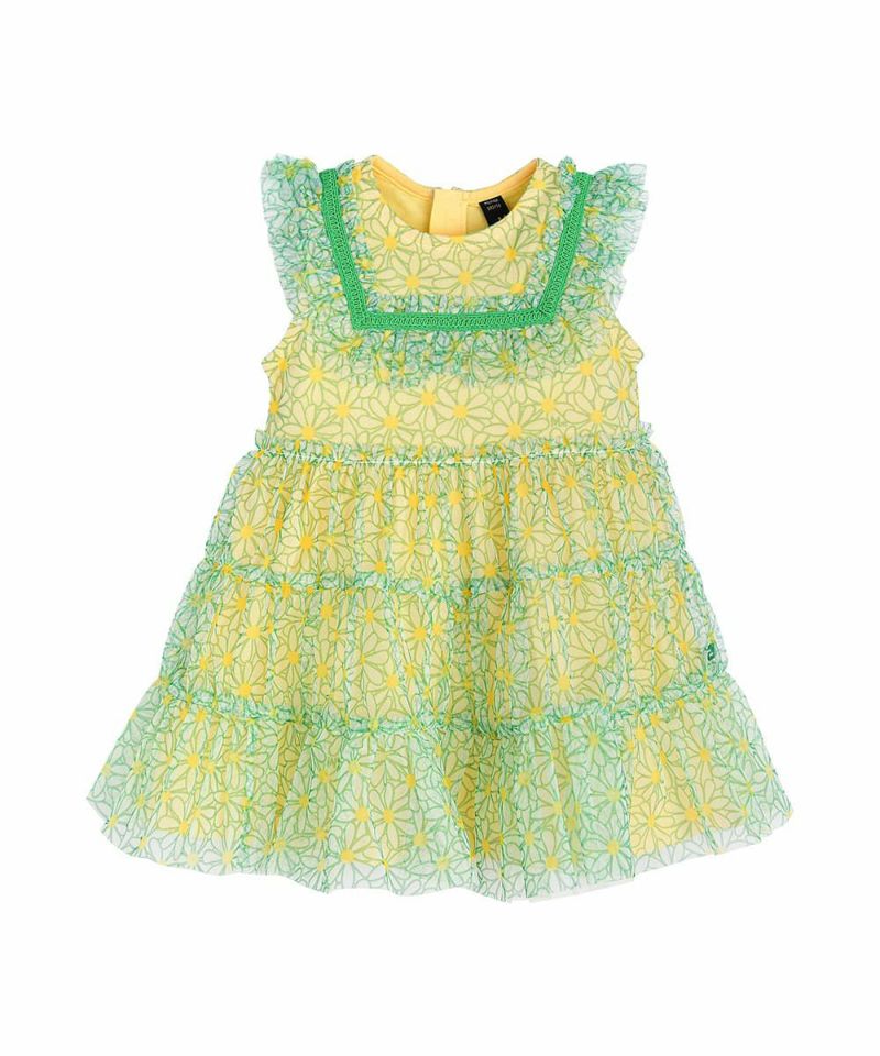 セレモニーSTYLEや特別な日にピッタリなワンピース。イエローのワンピースにグリーンのフラワーチュールを重ねたボリュームのあるデザイン♪フリルにグリーンレースがかわいさをアップしてくれます。