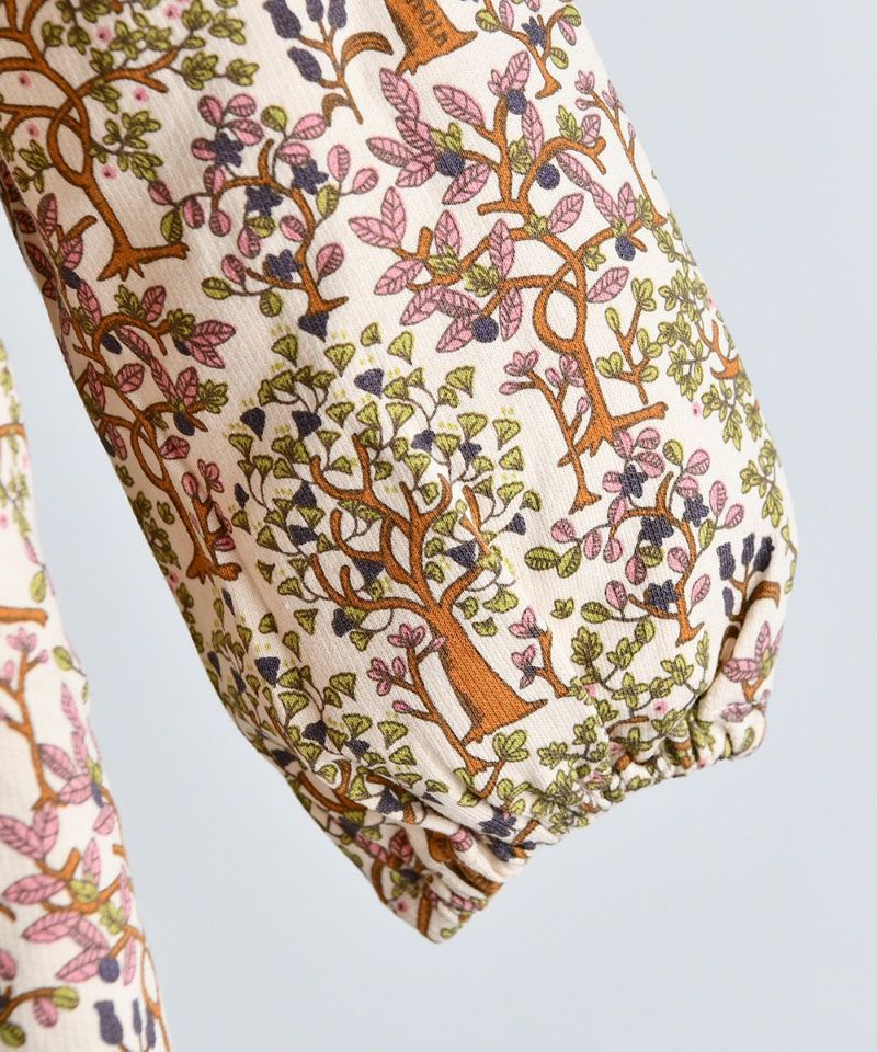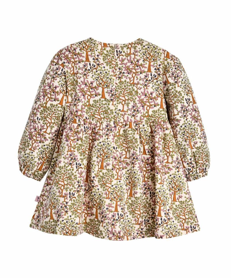 コットン素材で肌触りよく、楽に着用できる高級感のある木がモチーフのワンピース。ユニークな襟の形とフリルポイントで女の子らしさをアップしてくれるアイテムです。