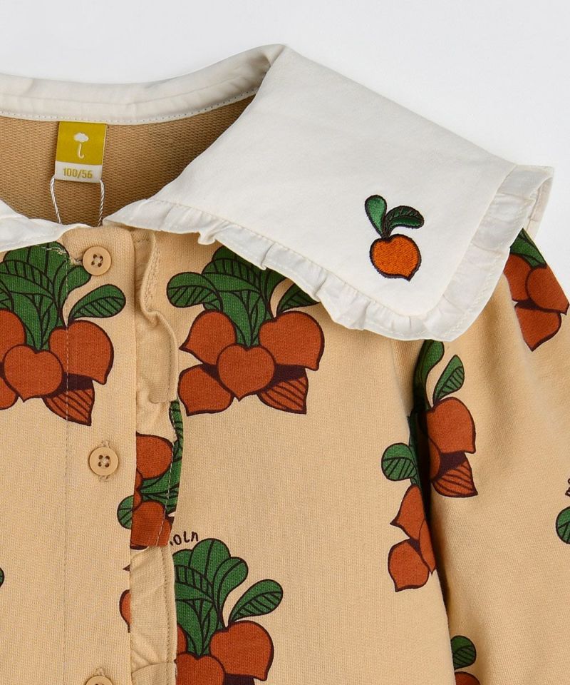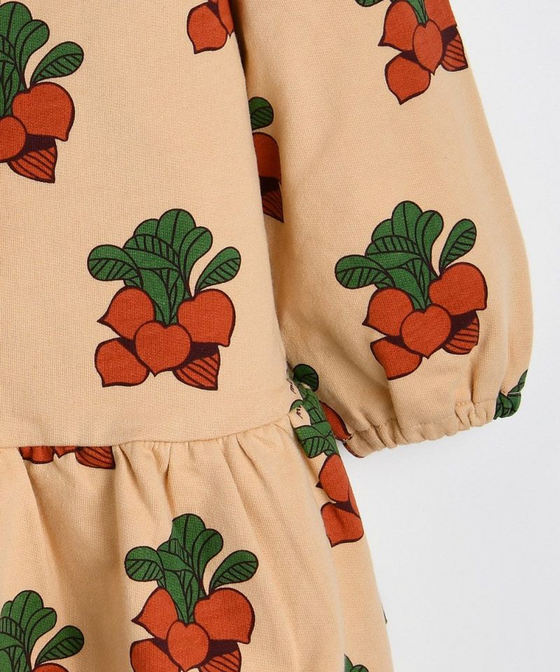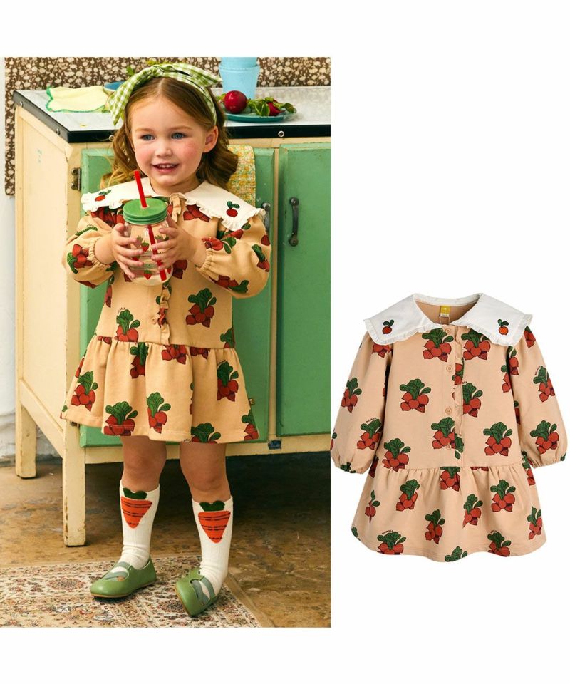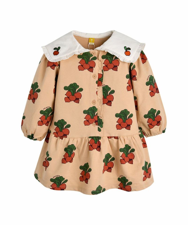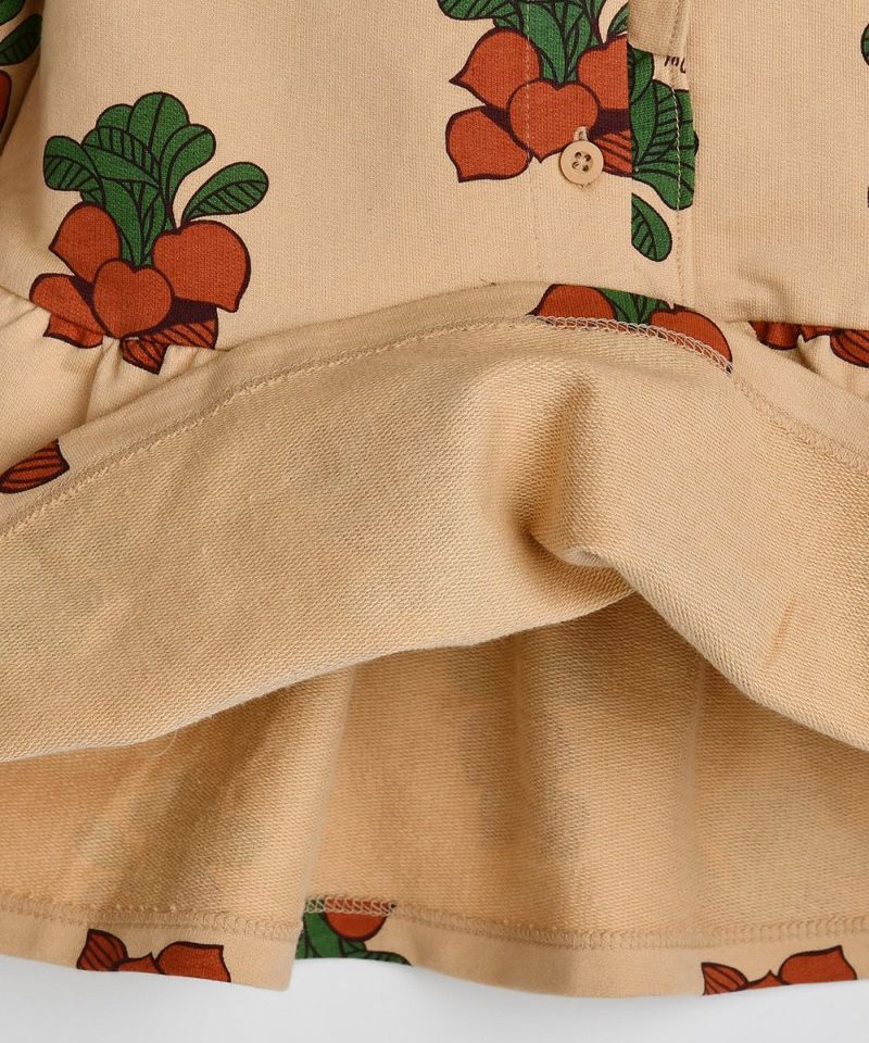 スウェット素材で動きやすく、肌触りも良いラディッシュモチーフのワンピース。ネックから肩までの襟の形や刺繍がポイントのかわいいアイテムです。