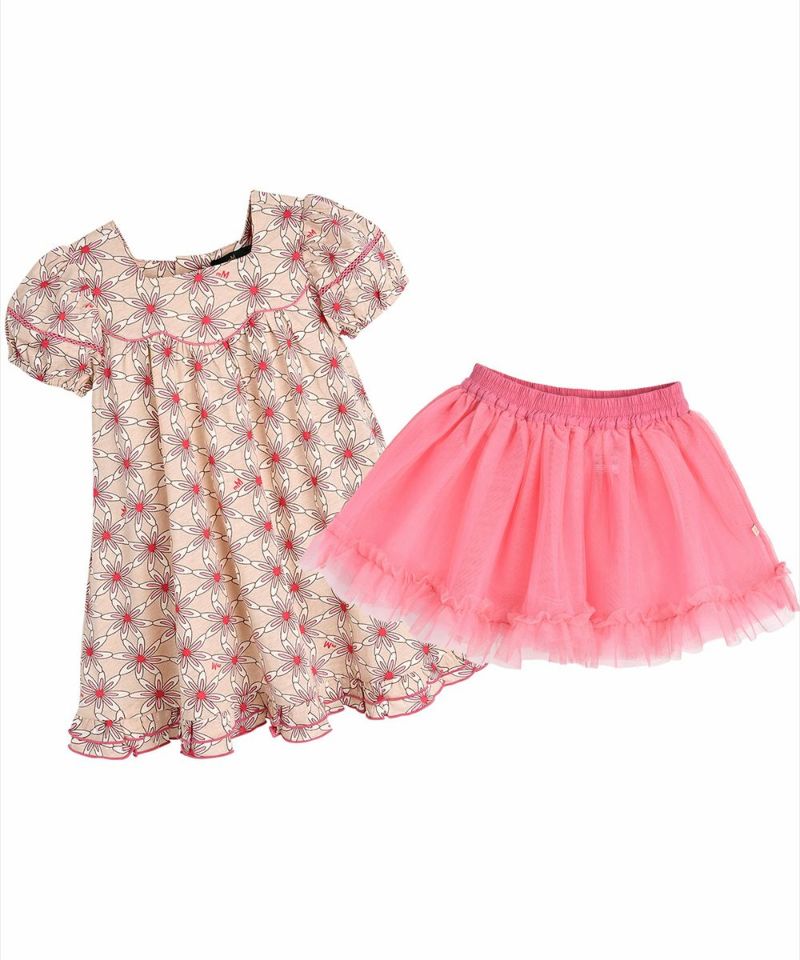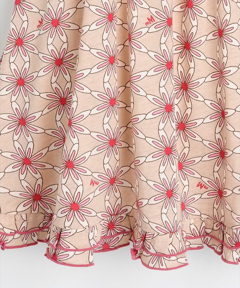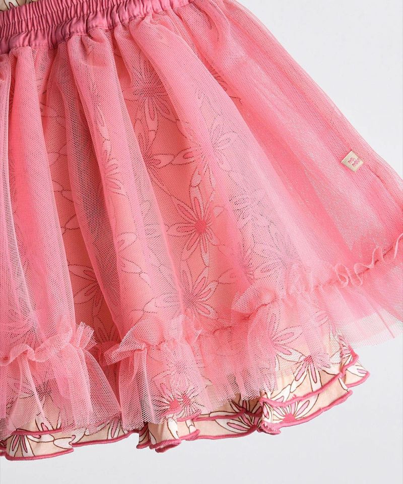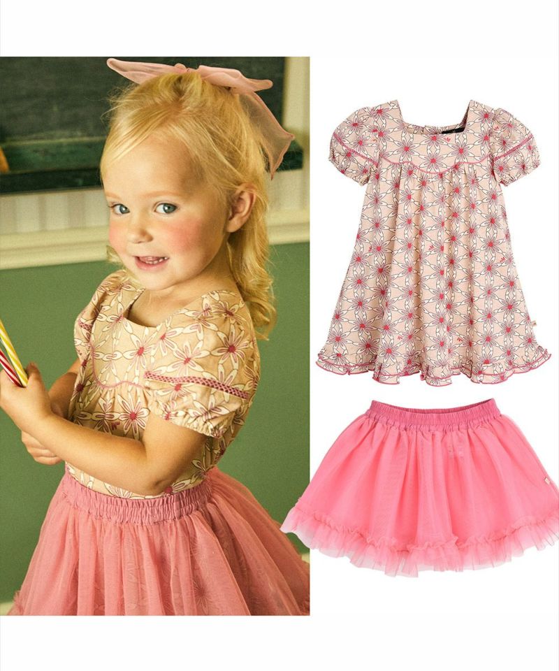 しっかりとしたシルケット素材のフラワー柄半袖のワンピースとチュールスカートがセットになったワンピース。 ワンピース単独で着てもラブリーなアイテムです。