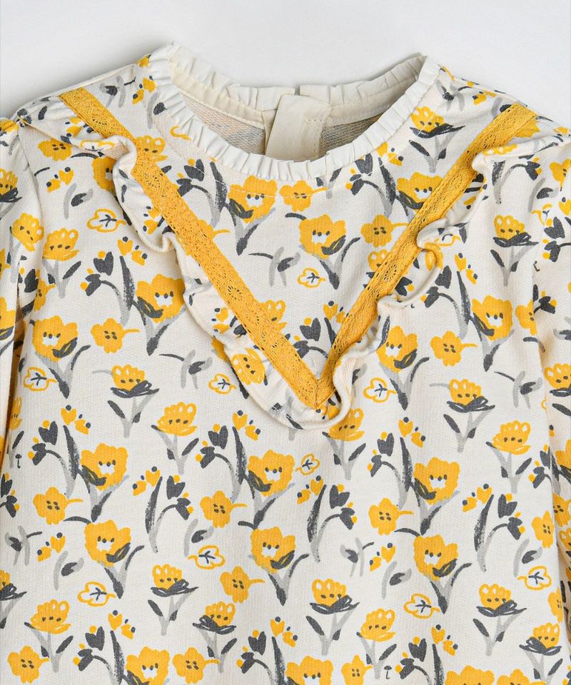 イエローとグレーを組み合わせたレースとラブリーなフリルがポイントのムードのある総柄フラワーワンピース。薄くて軽い素材で製作してのどかな春の日のピクニックルックのおすすめアイテム。【2点セット】ローレンカバーオール&ヘアバンド(M251ROB09P)と姉妹ルックがおすすめです。