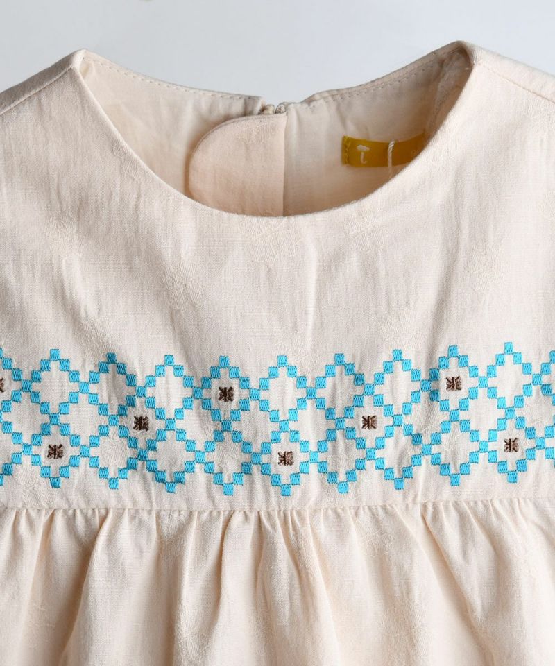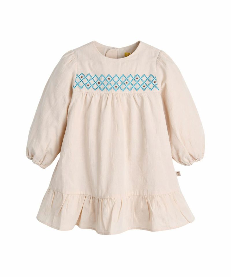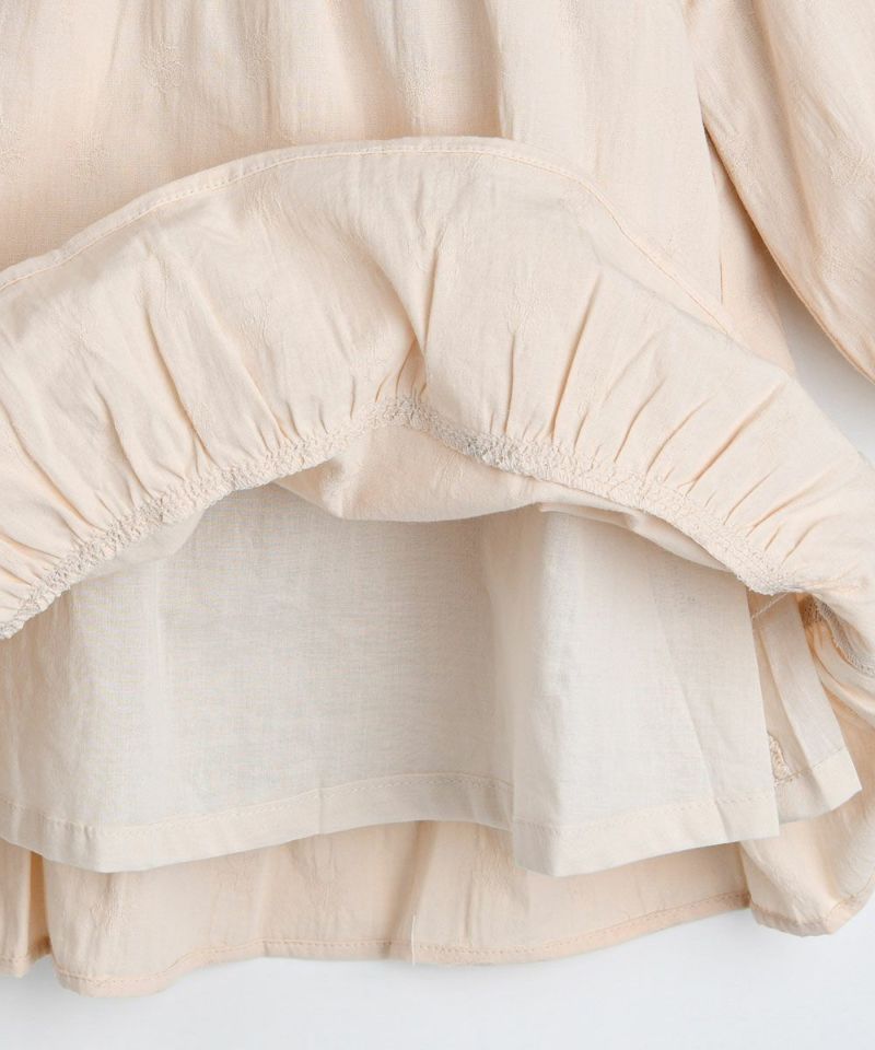 ほのかなクローバー模様の織り目が高級感があり、軽くてさわやかな春のカラーに刺繍でカラーポイントをつけたワンピース。裏地付きで、春の季節の変わり目に着用しやすく、春先にはレイラニットベスト(M251VEG16P)とのコーディネートで、保温性を高めると◎!