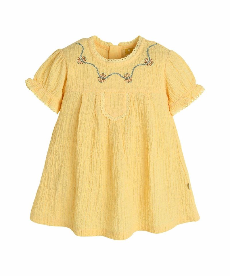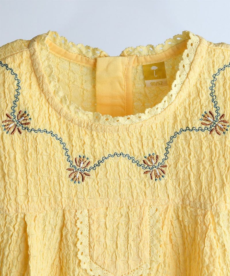 涼しい 素材を使用している半袖のワンピース。幾何学フラワー刺繍とレースの飾りが女性らしさを引き立たせてくれるアイテム。華やかなイエローカラーで注目の的になる事間違いなし♪
