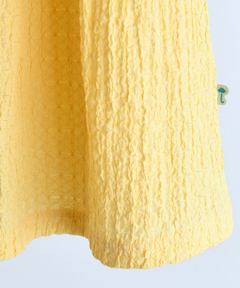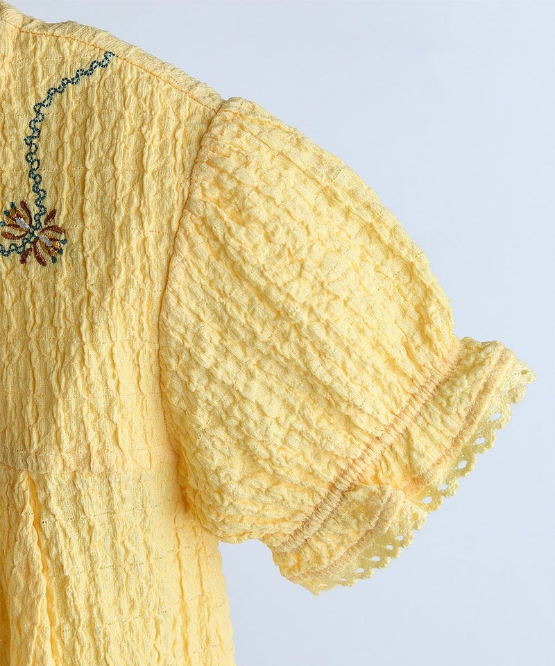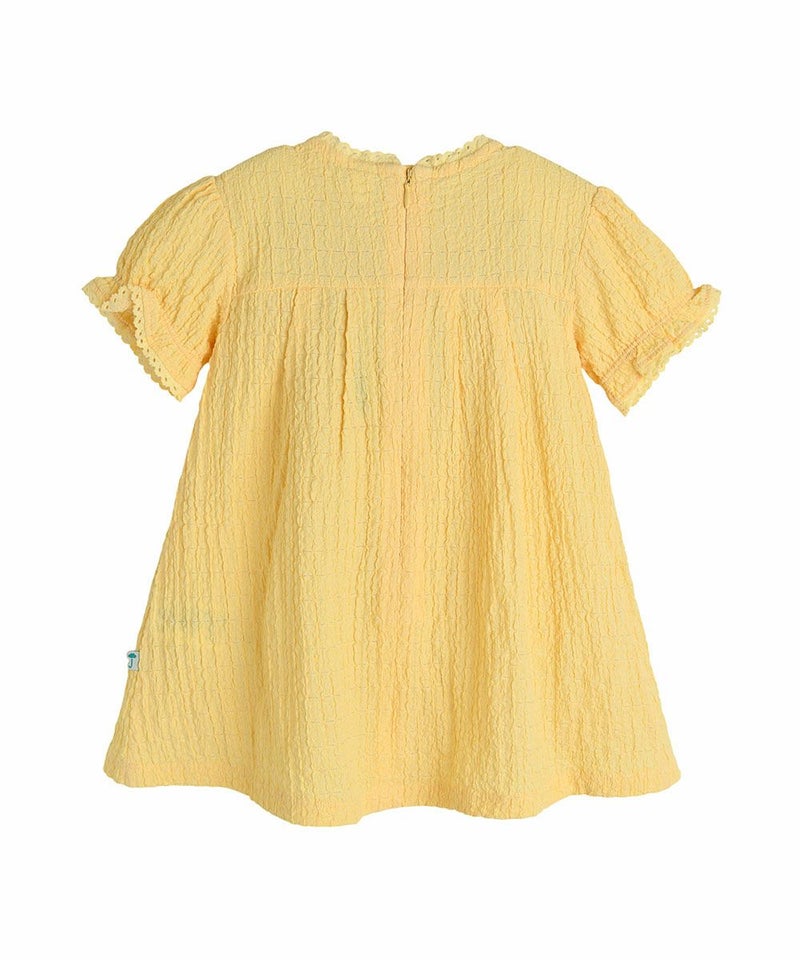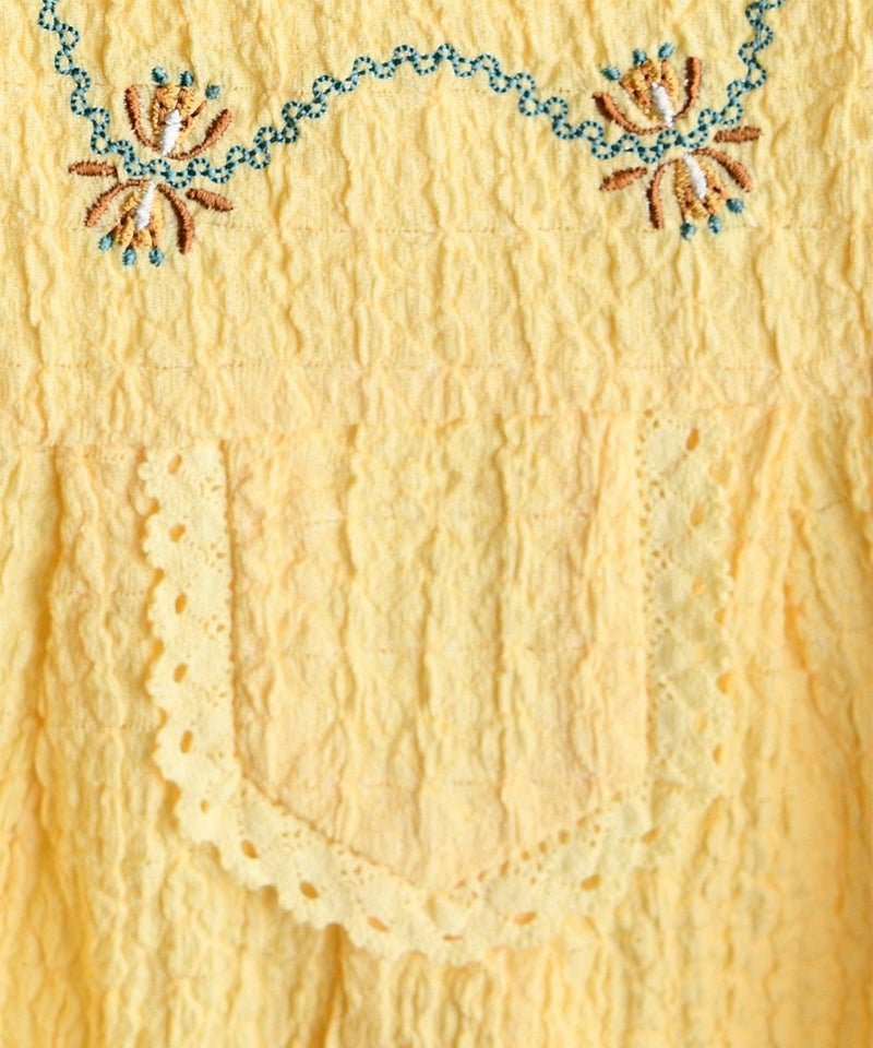 涼しい 素材を使用している半袖のワンピース。幾何学フラワー刺繍とレースの飾りが女性らしさを引き立たせてくれるアイテム。華やかなイエローカラーで注目の的になる事間違いなし♪