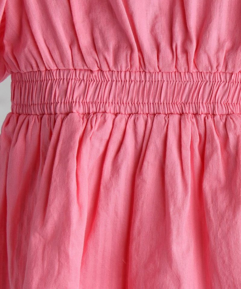 涼しい素材の鮮やかなピンクカラーでデザインされた半そでワンピース。袖口が翼のように広がっおり、後ろのスリットがVラインになっているため、より女性らしく涼しい雰囲気で、暑い夏に大活躍のアイテムです。