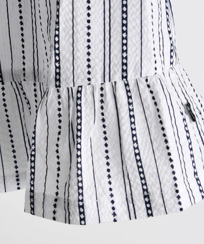 モイモルンならではのユニークなストライプパターンの半袖ワンピース。動きやすく通気性の良い素材のため、着心地が快適で、袖と裾のフリルがラブリー。図形刺繍ポイントとネイビー レース 配色 ディテールが端正さをプラスするアイテムで、マリカバーオールセット(M252ROB15P)と姉妹ルックがおすすめです。