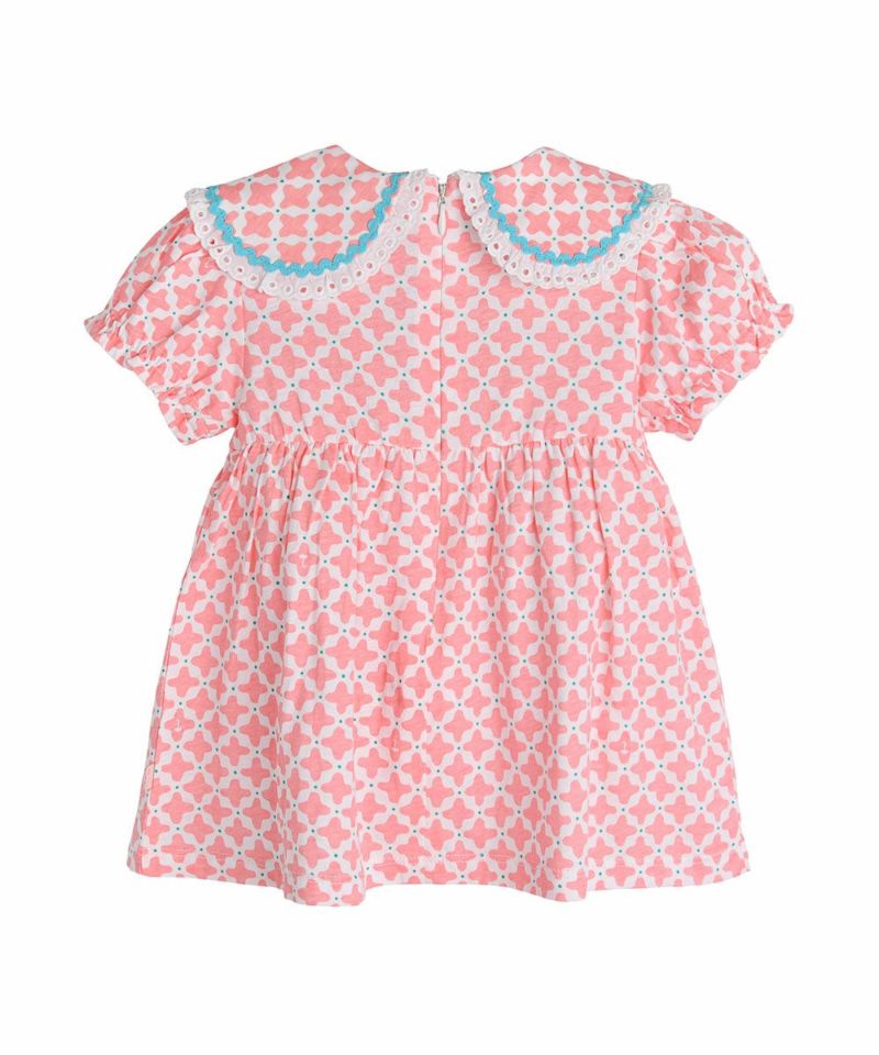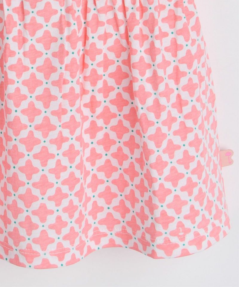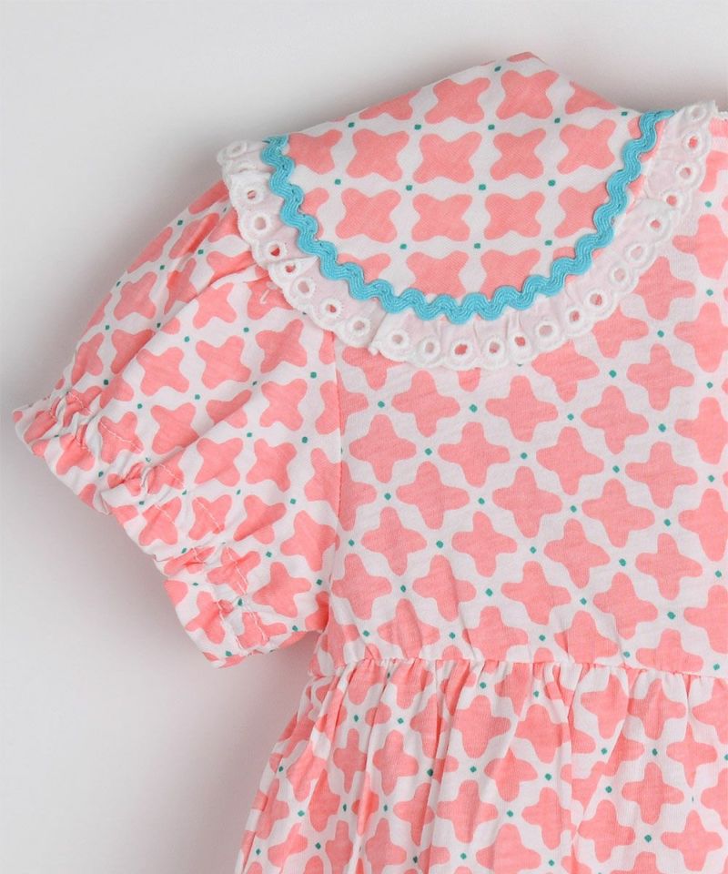 華やかなピンクカラーの幾何学図形総柄でデザインされたレトロなムードの半袖ワンピース。襟のパンチングレースとミントカラー配色テープがラブリーで、エンザイム加工により着心地がさらに柔らかく洗濯後も変形が少ないアイテム。