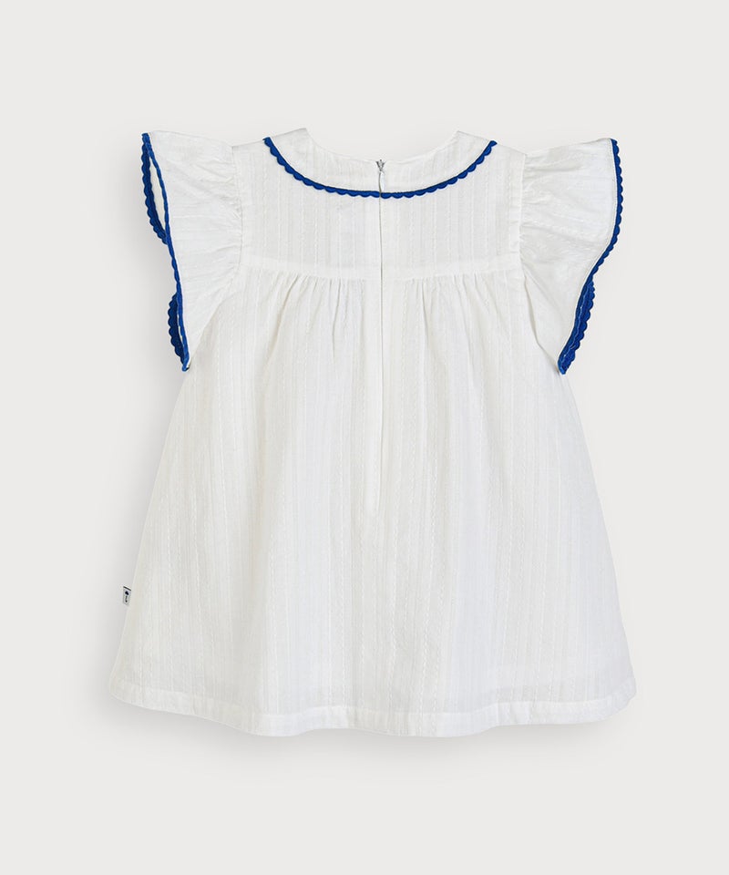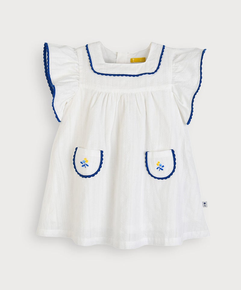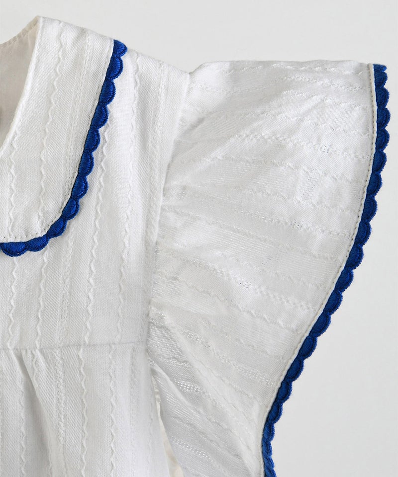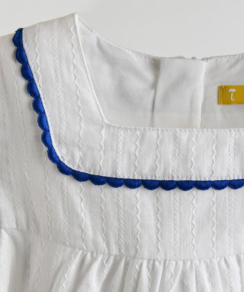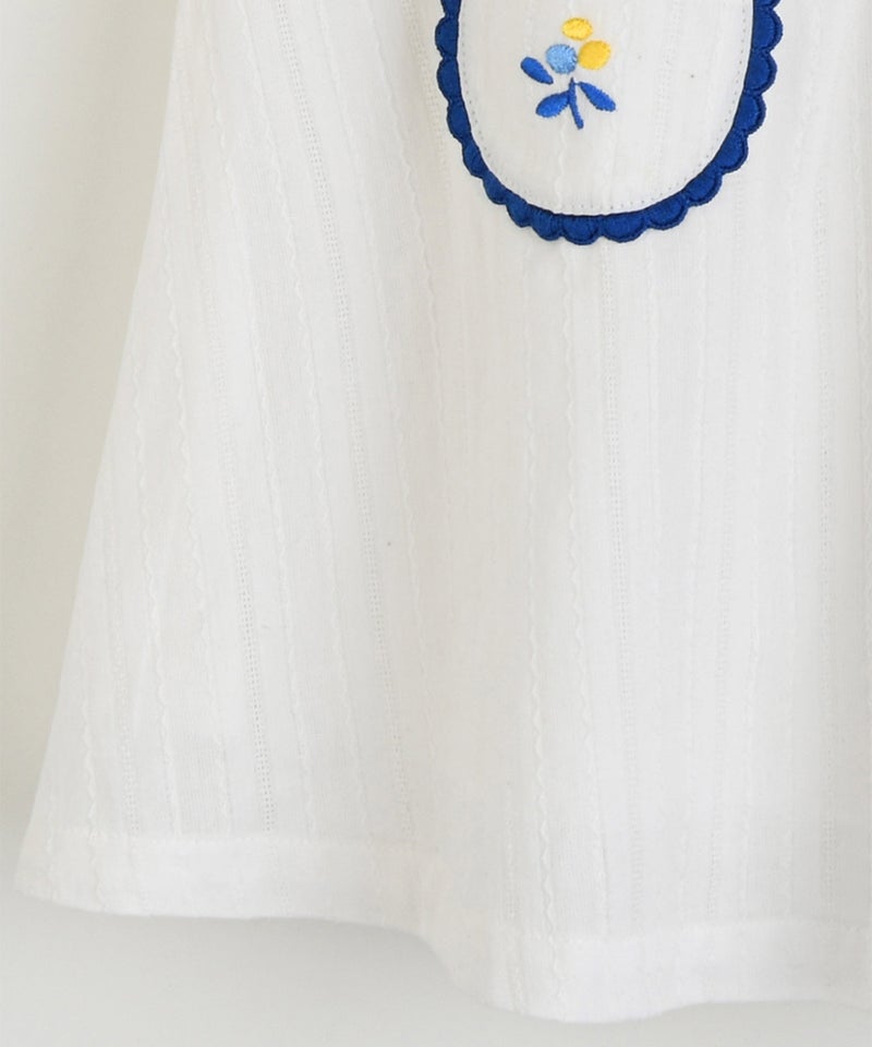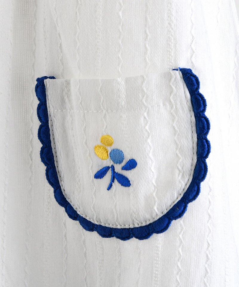 ブルーベリー刺繍やブルーのカラーパイピングがポイントのホワイトワンピース。