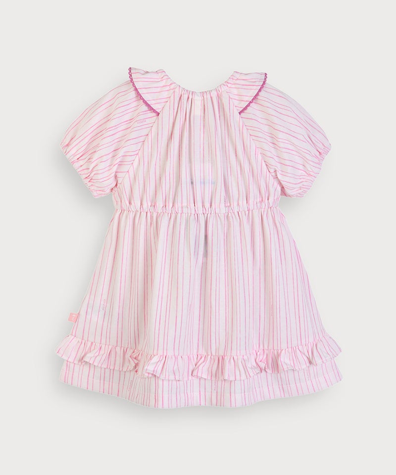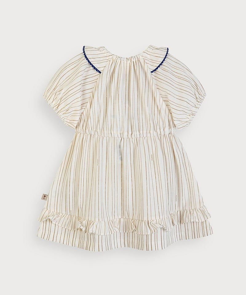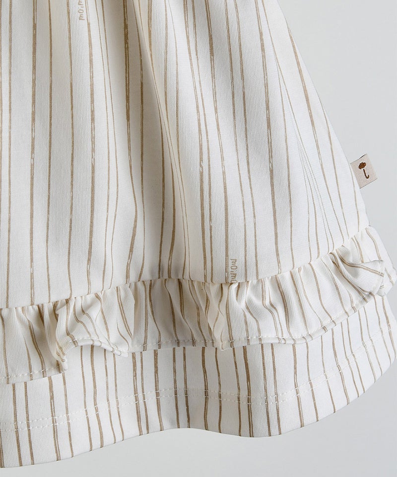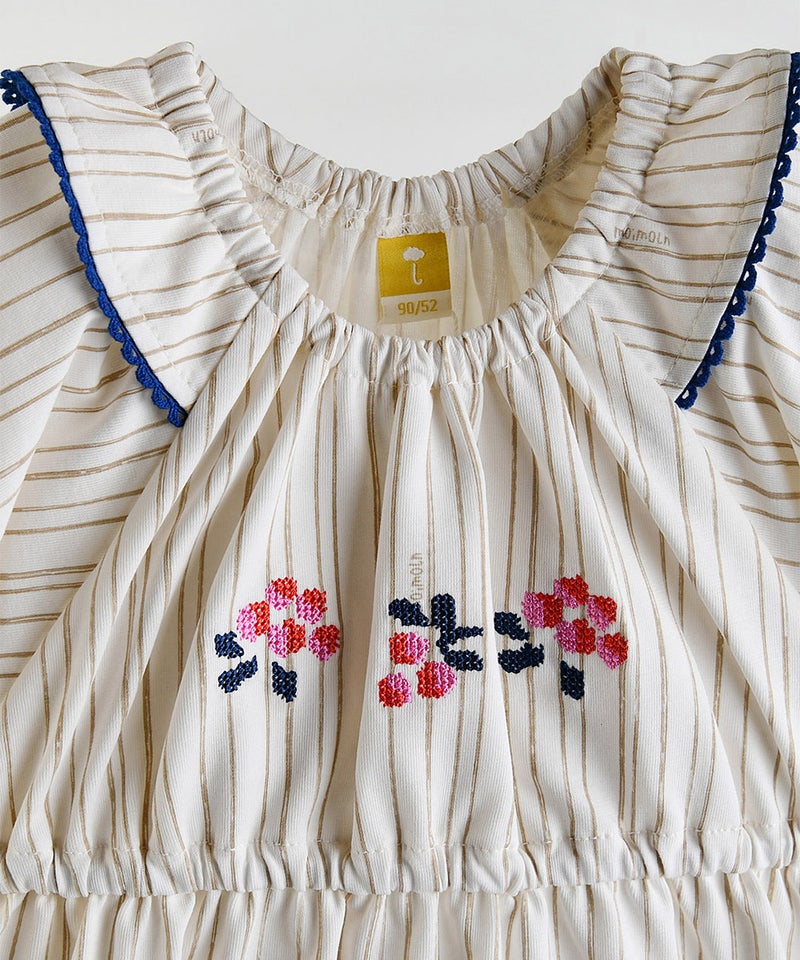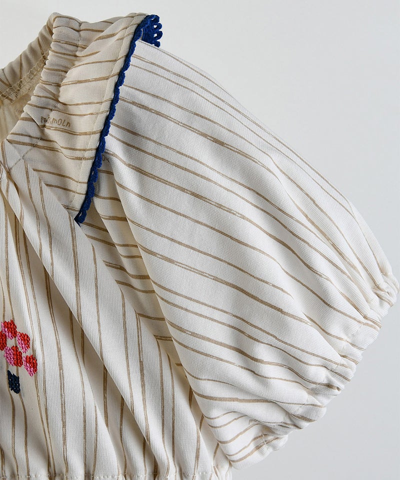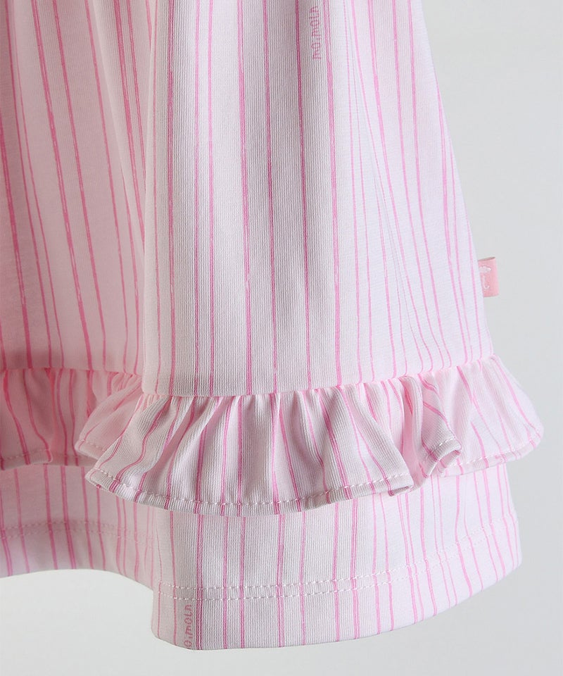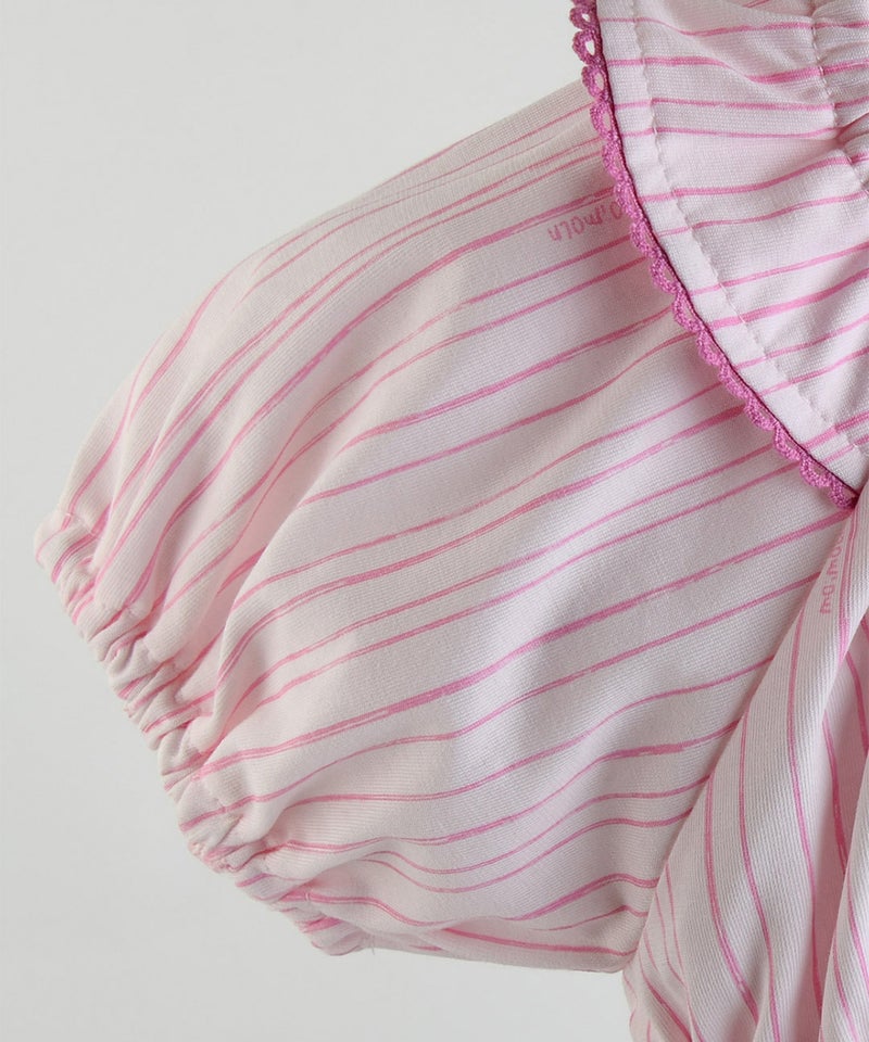 アームホールや裾のフリル使いでラブリーさをプラス、首回りはゴム入りで脱着が簡単です。
