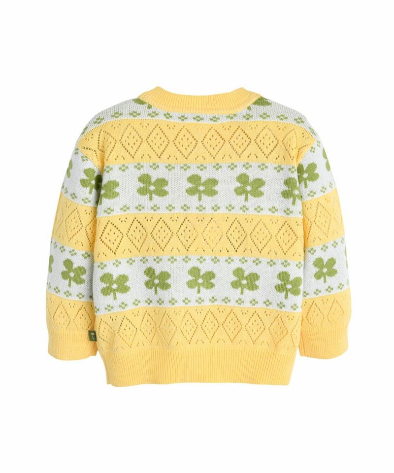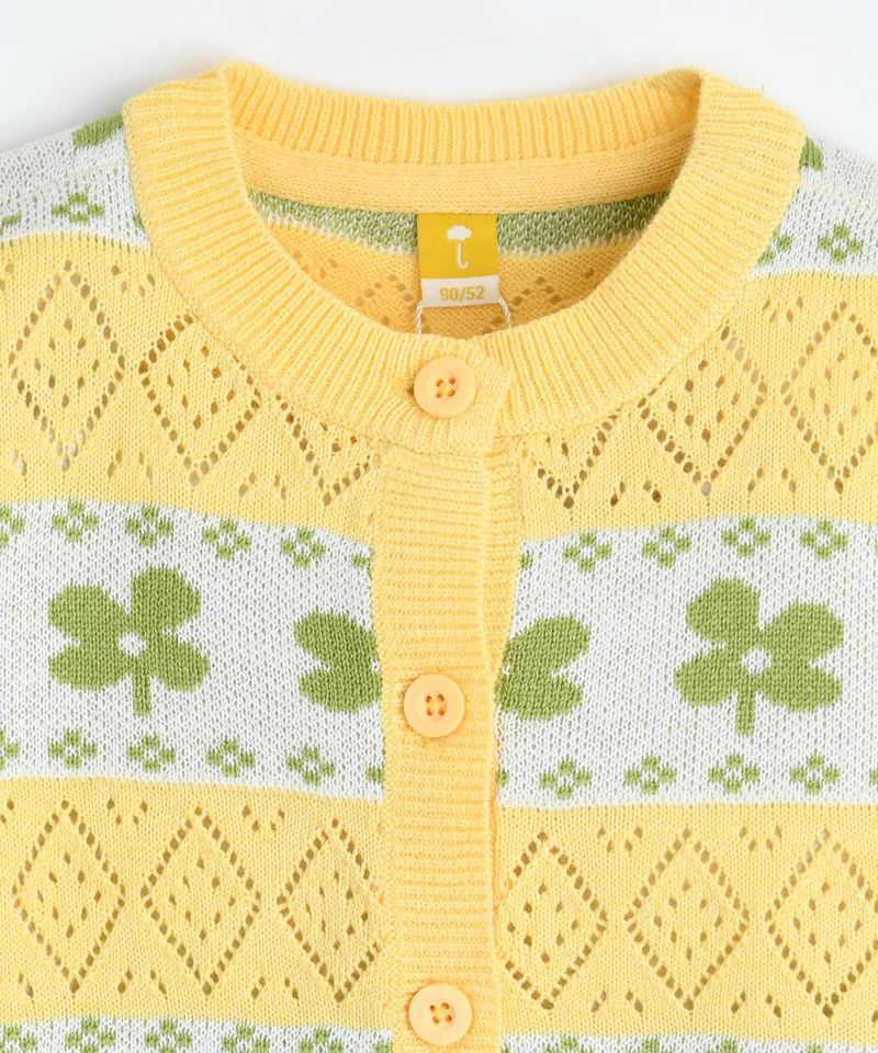 新芽形のモチーフと季節感が引き立つ明るいカラーが華やかなコーディネートになるニットカーディガン。ヘイリーウーブンワンピース