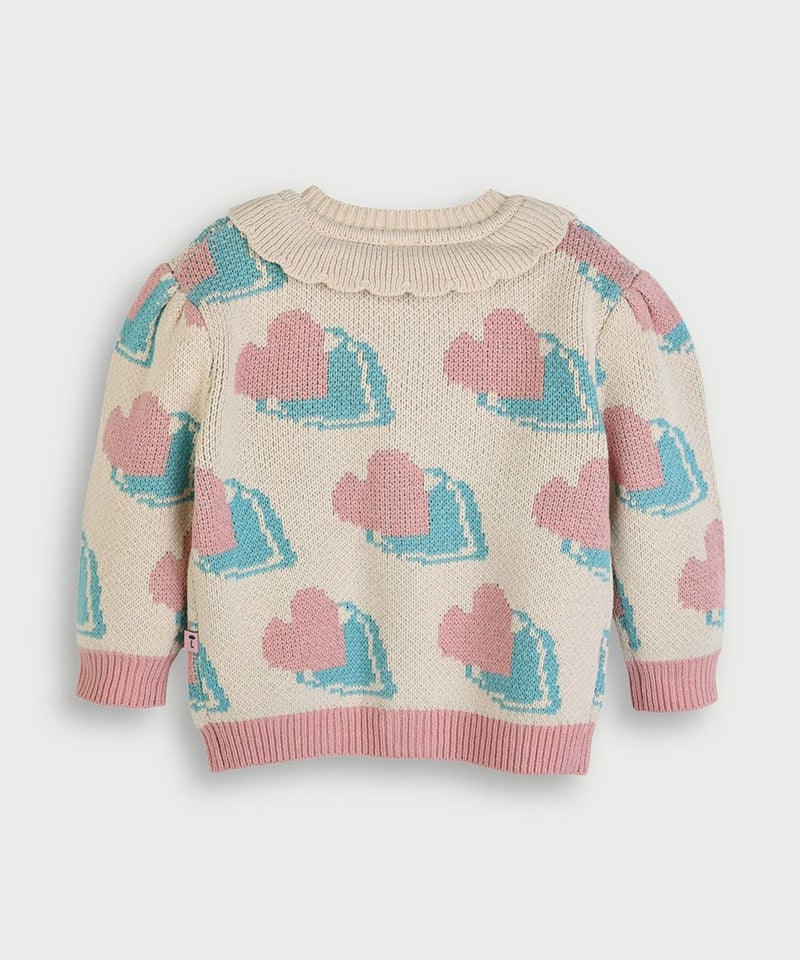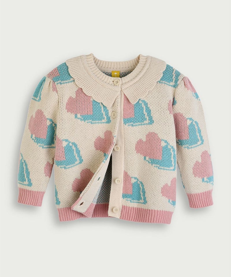 厚手でしっかりとしたコットンとアクリルのMIX生地の長袖ニットカーディガン。ユニークなハートモチーフとミントとピンクの配色がとてもCute、襟元のフリルがよりコーディネートのアクセント。ポイントコーディネートに活用しやすいアイテムです。