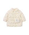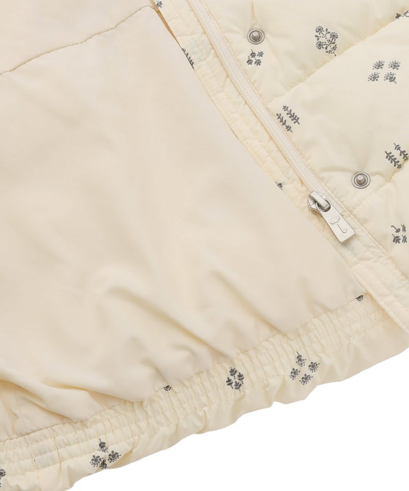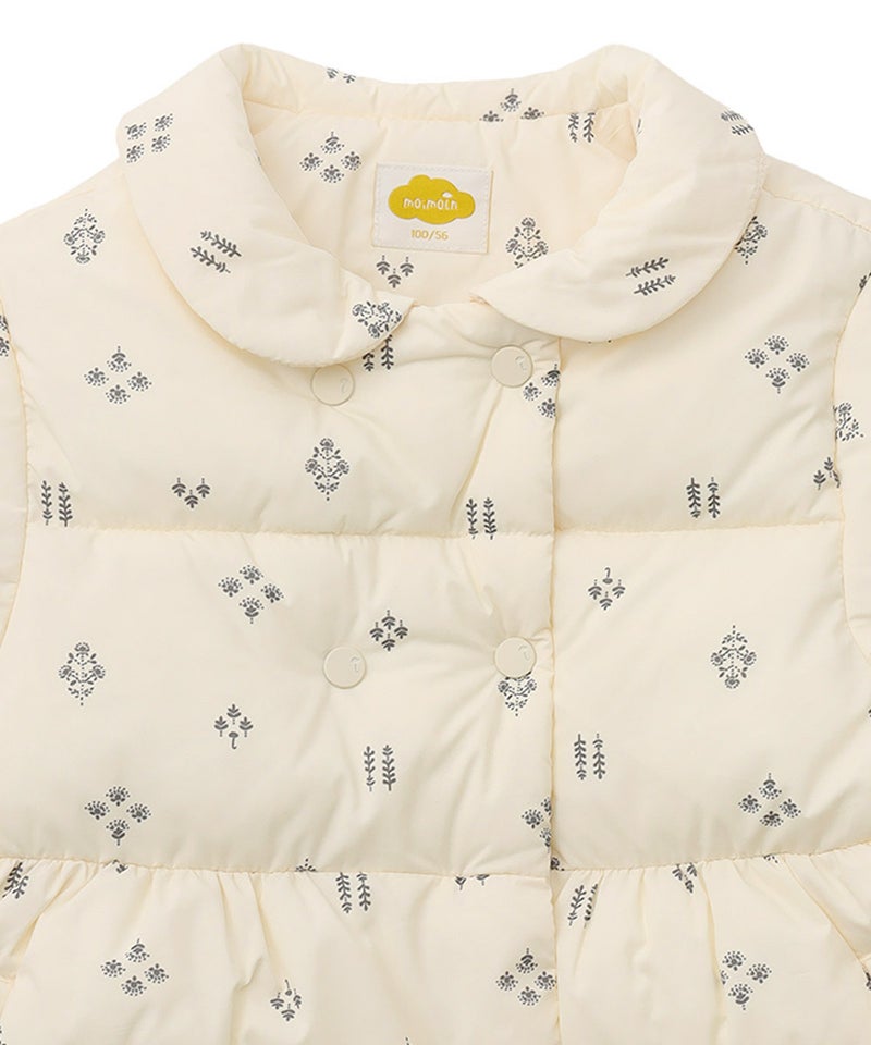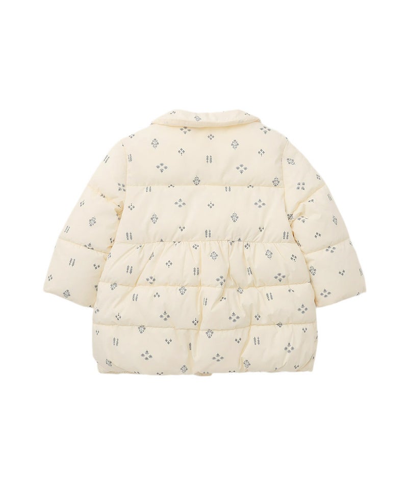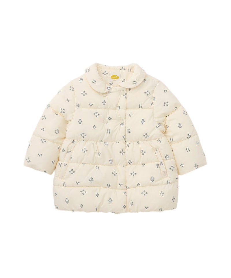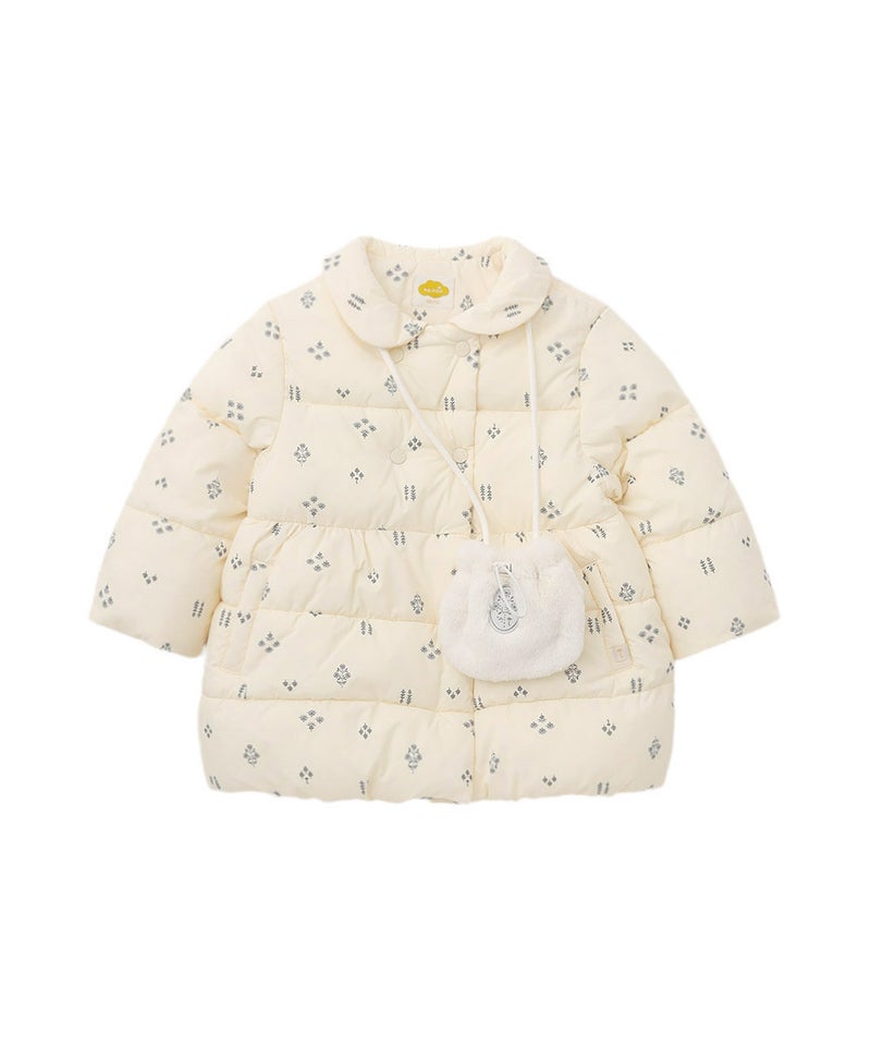 フェイクファーバッグがセットになったクラシックなパターンのポリエステル100%の中綿コート。Aラインシルエットに切り替えとシャーリングでボリューム感を加え、、同系色のボタンで脱着も簡単。軽くて保温性に優れたアイテムです。