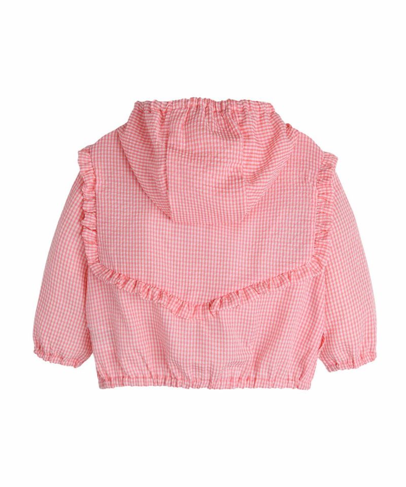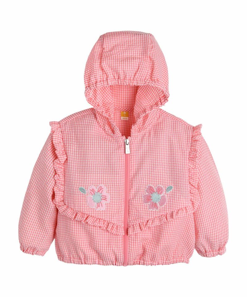 じめじめして汗をかきやすい暑い夏でも体に引っ付きにくい清涼感を感じさせるシアサッカー生地の長袖ウィンドブレーカー。前板の花刺繍とフリル装飾で女の子っぽくて可愛らしさを表現したデザインのアウター。
