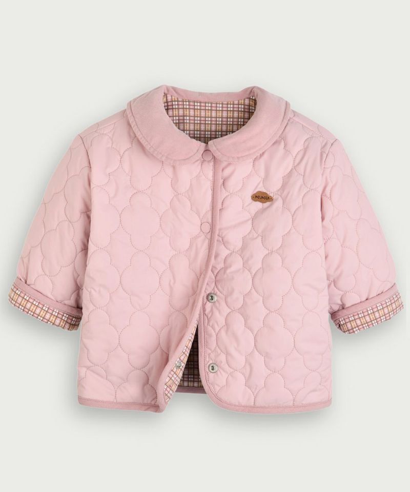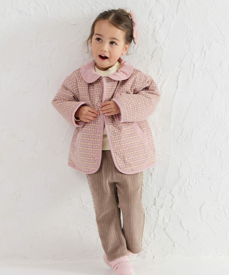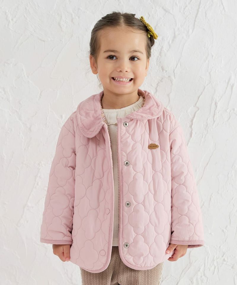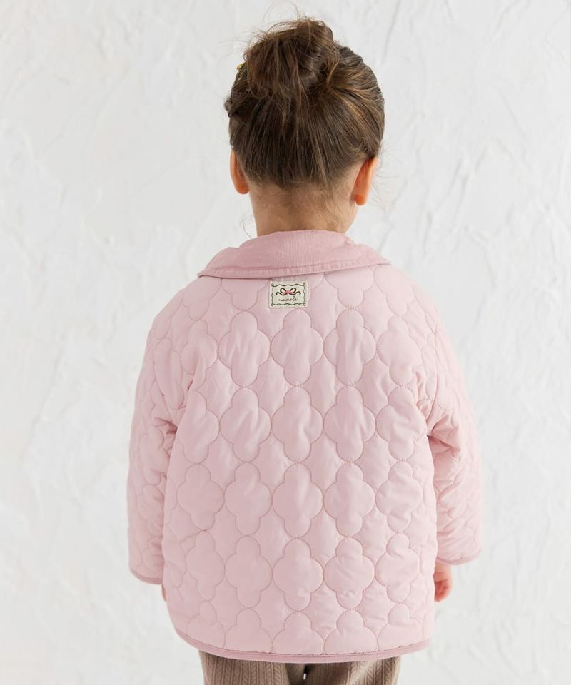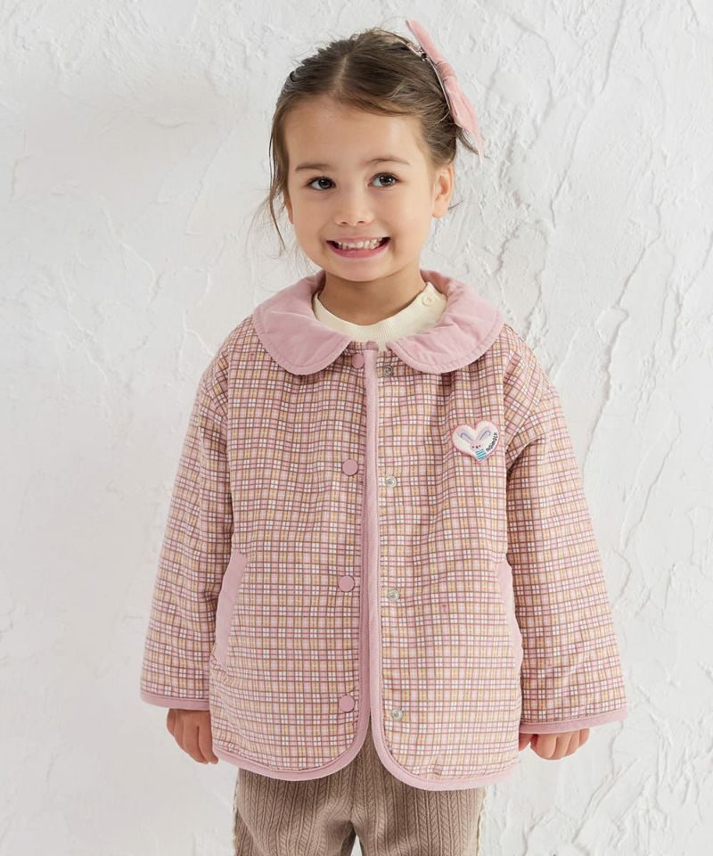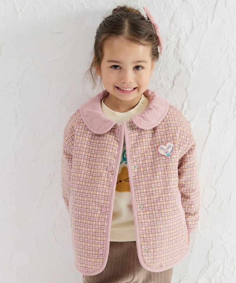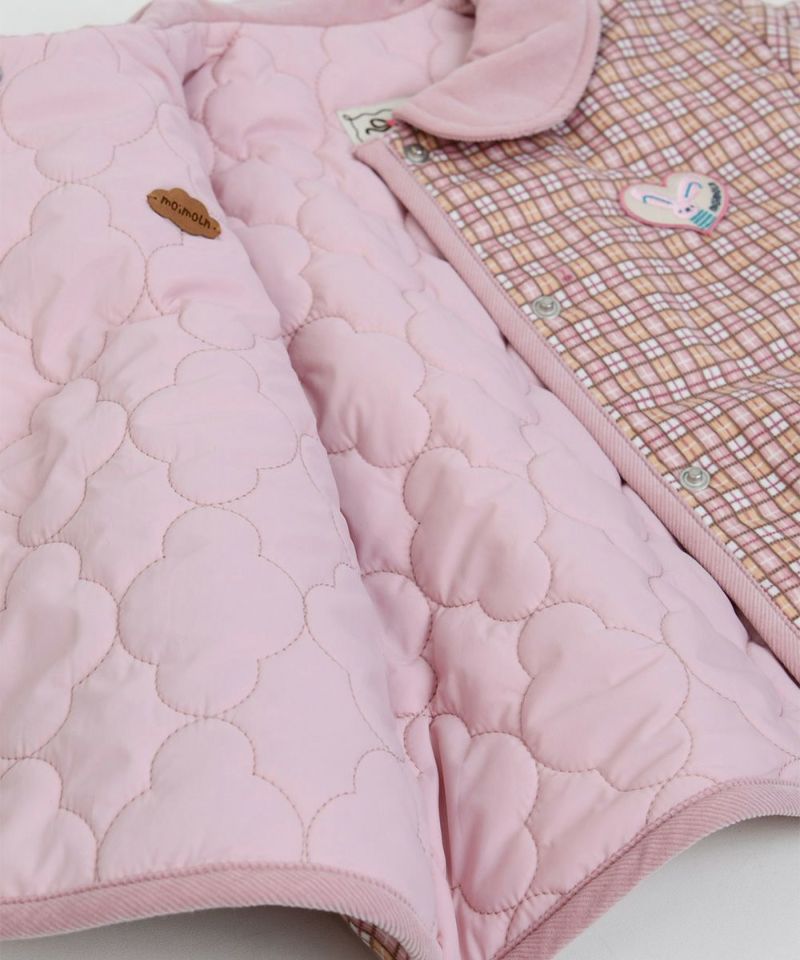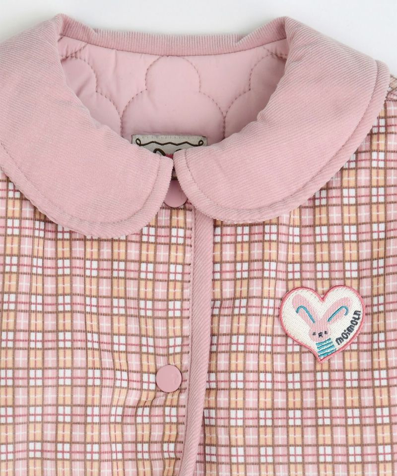 Cuteなピンクのワントーンキルティングとチェック柄のどちらも活用度の高いリバーシブル軽量中綿ジャケット。ユニークな形のキルティングパターンに同系色の コーデュロイの丸襟が可愛いアクセントに、胸元にはmoimolnブランドポイント付き。 チェック柄には、胸元にハートのウサギのフォレの刺繍ワッペン付き。どちらもボタンでの脱着で同系色のカラーボタンとなっています。ラブリーでありながらカジュアルなムードが感じられ様々なコーディネートで演出できるアイテム。ソロやパディング詰め物を使用し軽くて保温性に優れている季節の変わり目に着やすいアイテム
