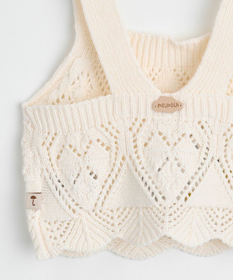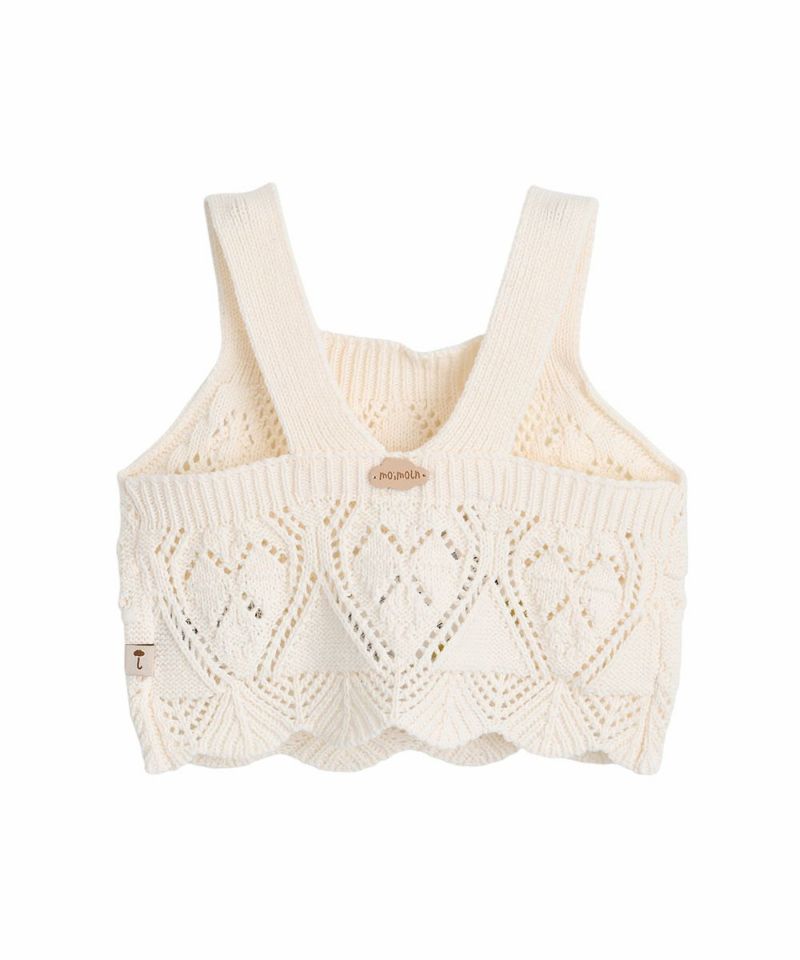 ラブリーなと特徴的な透かし編みで可愛さを加えたビスチェスタイルの女の子らしいニットベスト。ヘイリーウーブンワンピース(M251OPB07P)、ブルーチェックワンピース(M251OPB08P)とコーディネートがおすすめです。