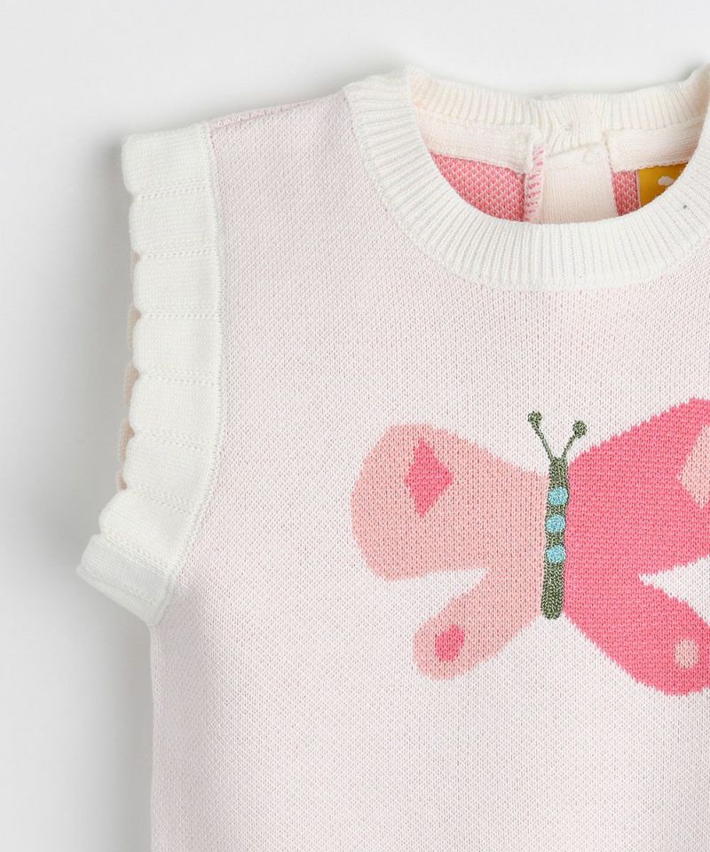 可愛い蝶の形のモチーフが目立つニットベスト。アームホールラインのふっくらとした組織感が可愛らしさを引き立たせ、華やかなカラー感がコーディネートのポイントになるアイテムです。